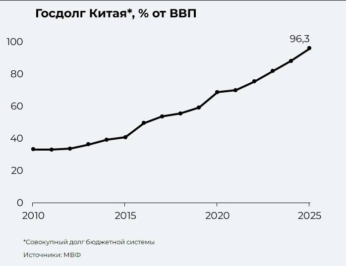 Друзья, всем привет! Все привыкли обсуждать госдолг США, Японии, Франции и Италии, взвешивая риски дефолта. Но на сцену врывается Китай. Госдолг Поднебесной вырос с 41% в 2015 году до 96% в 2025-м. ➡️ Причины — огромные траты на сдерживание ковида, технологическое соперничество и торговые войны с США, лопнувший пузырь на рынке недвижимости. Все причины, кроме ковида все еще актуальны, а потому дефицит бюджета составляет колоссальные 8,6% от ВВП, и снижать его не собираются. ▪️А на деле все еще хуже, если учесть скрытый долг местных бюджетов. Они активно занимали не напрямую, а через инвестиционные компании. А уже эти компании выпускали муниципальные облигации, деньги от которых инвестировали в местную инфраструктуру. А затем эти обязательства гасились за счет продажи госземли под застройку. Такая схема получила название «механизм финансирования местных органов власти» (LGFV). Несложно догадаться, что из-за кризиса на рынке недвижимости LGFV больше не работает. Долгов много, а доходов о