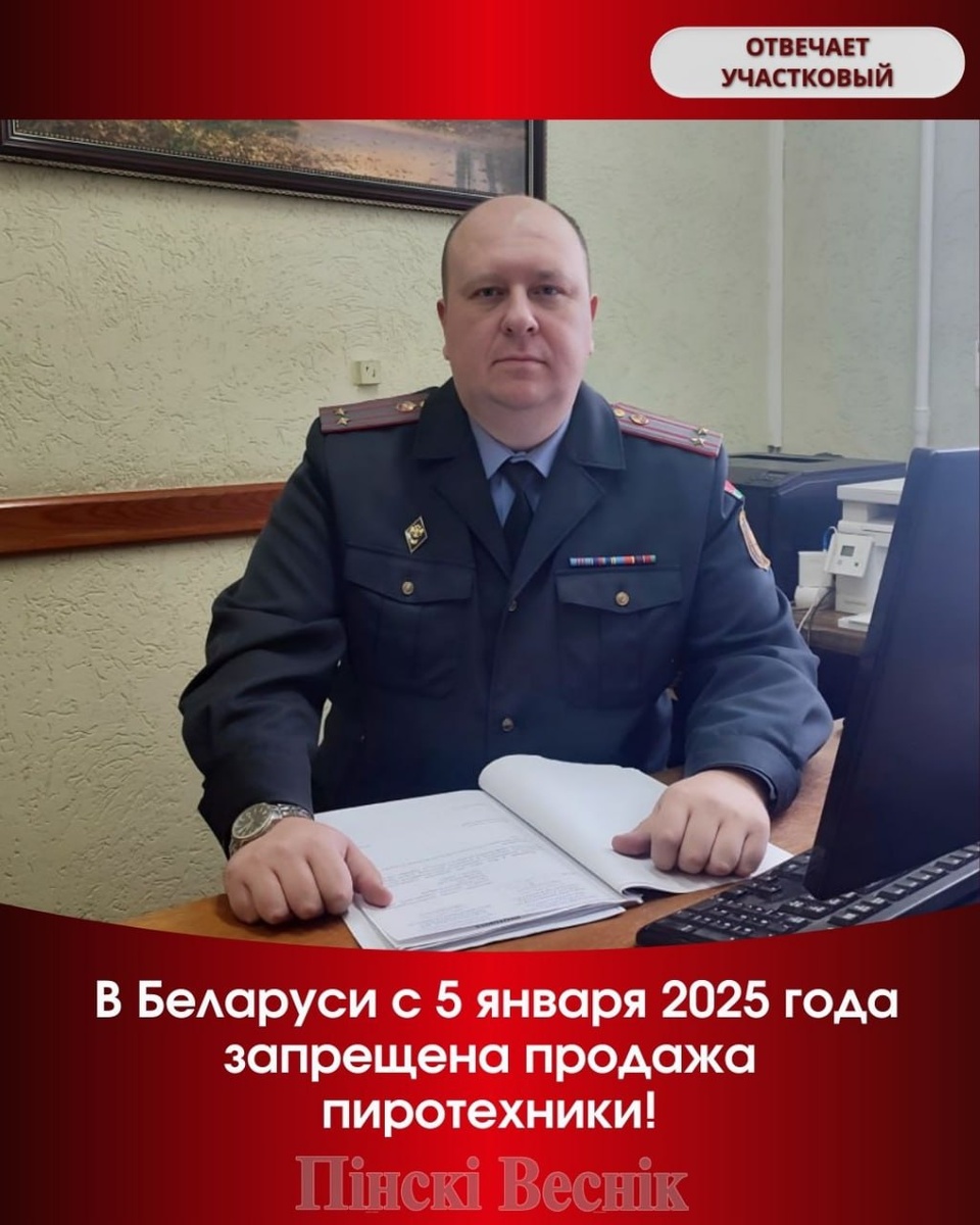 😊😊😊 ➖В Беларуси с 5 января 2025 года запрещена продажа пиротехники! ➡️Согласно постановлению Совета Министров, закон запрещает розничную и оптовую продажу изделий II, III, IV и V классов опасности. Исключения составляют только бенгальские огни, хлопушки и холодные огни. ⏩Все виды фейерверков, салютов и петард не могут быть проданы ни в магазинах, ни на рынках. За нарушение данного запрета грозит административная и уголовная ответственность. ⏩Организации с специальным разрешением продолжат проводить фейерверки на общественных мероприятиях. ⏩По вопросам можно обратиться к участковому инспектору милиции каждую среду с 10:00 до 13:00. @Пинский Вестник 📱Ютуб 📱ВК 📱ИНСТАГРАМ 📱ОК 📱ФЕЙСБУК 📱ТИК ТОК Прислать новость