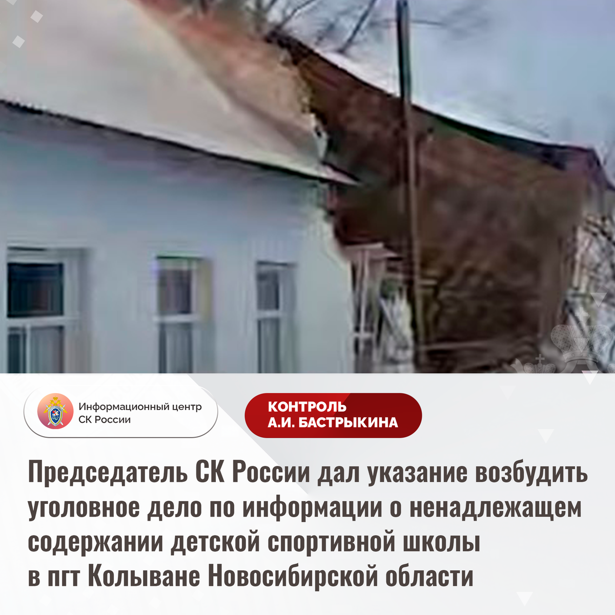 Председатель СК России дал указание возбудить уголовное дело по информации о ненадлежащем содержании детской спортивной школы в пгт Колыване Новосибирской области В сети Интернет сообщается о ненадлежащем содержании детской спортивной школы в поселке городского типа Колыване Новосибирской области. В 2019 году в стенах здания 1963 года постройки появились трещины. Несмотря на высокий процент износа конструкций, занятия для несовершеннолетних продолжались. В ноябре текущего года строение признано аварийным. Из-за длительного отсутствия ремонта 24 декабря текущего года обрушились потолочные перекрытия, кровля и одна из стен школы. В СУ СК России по Новосибирской области организована процессуальная проверка. Председатель Следственного комитета Российской Федерации Александр Иванович Бастрыкин дал указание руководителю СУ СК России по Новосибирской области Евгению Геннадьевичу Долгалеву возбудить уголовное дело и представить доклад о предварительных и окончательных результатах его расследо