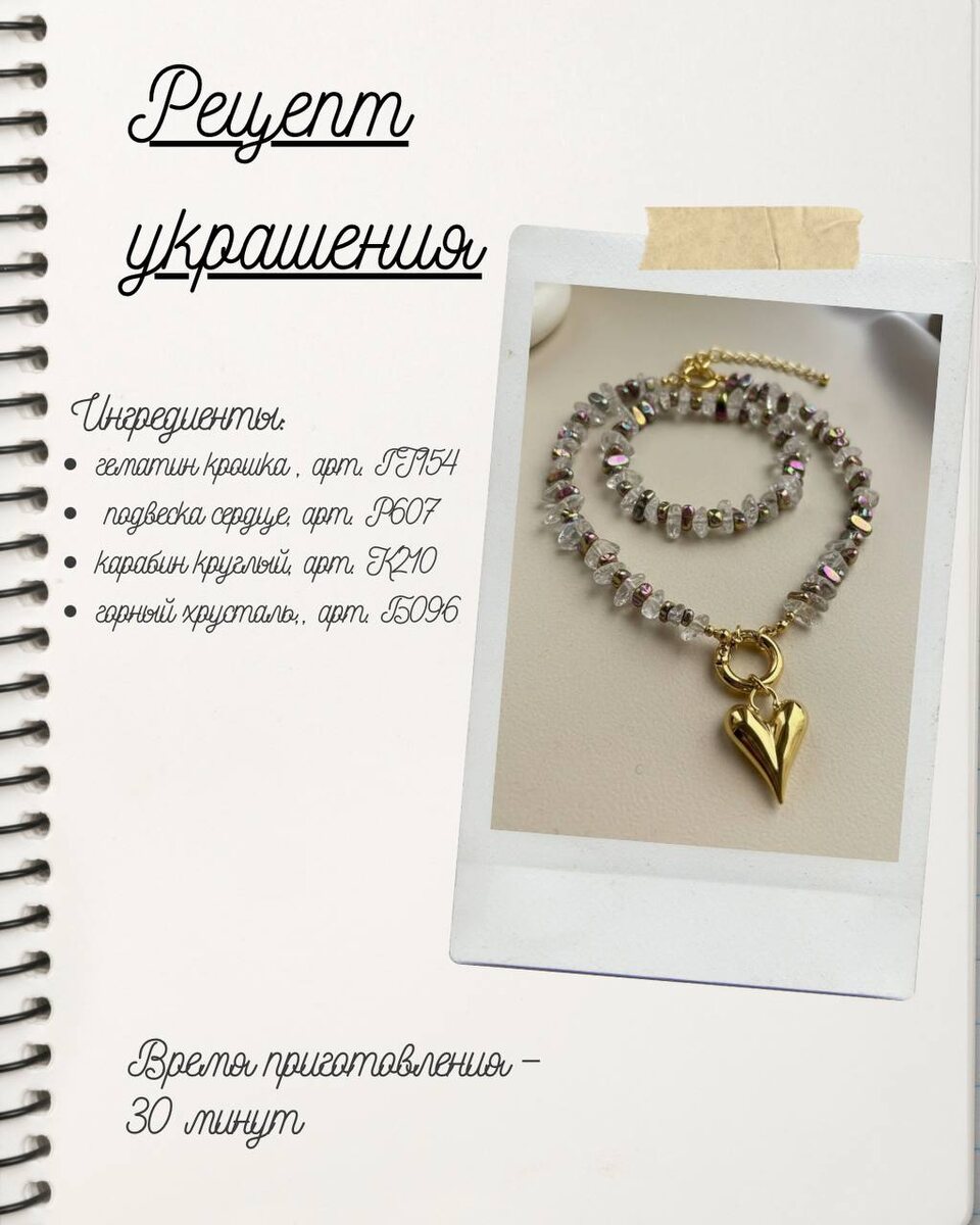 Сегодня готовим колье с сердцем – нежное, стильное и с настроением любви ✨ Ингредиенты 🍑 - Гематин гематит крошка галтовка, арт. ГТ154 - Подвеска объемное сердце, арт. Р607 - Карабин круглый Кольцо, арт. К210 - Горный хрусталь, крошка, арт. Б096 - Ювелирный тросик, арт. ТР02 - Кримпы зажимные, арт. М610 - Каллоты, арт. М604 Рецепт: Берём ювелирный тросик и аккуратно нанизываем хрусталь и гематит, чередуя текстуры и создавая красивый ритм. Фиксируем концы тросика с помощью кримпов и каллотов. Через соединительные колечки крепим карабин и главное украшение – подвеску-сердце. Финальный штрих – любуемся результатом и примеряем 💫 P.S. Ждём ваш отклик на нашу новую рубрику, которая пришла на смену Хочу/могу 🙌🏻