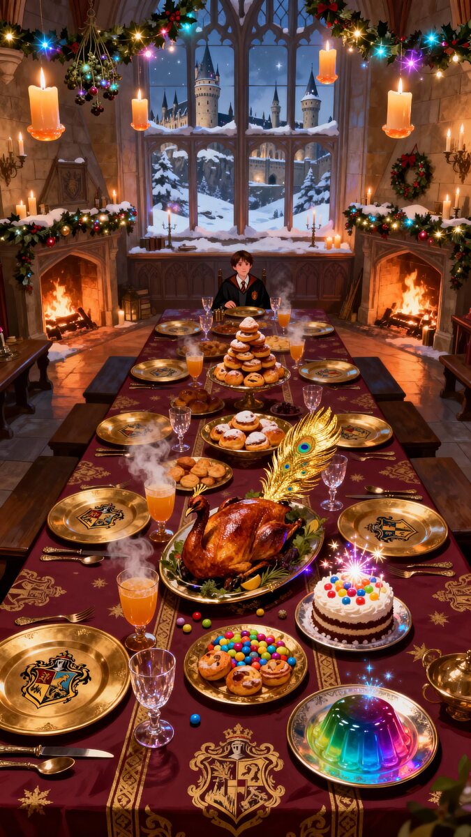Overhead view of a magnificent festive table in the Great Hall. Warm, cozy atmosphere of a magical celebration. **Details:** * agical ChrisA long table set with a burgundy tablecloth with gold patterns. Gold plates with house crests, crystal goblets. * ere of a magiRoasted peacock-pheasant with golden feathers, steaming pumpkin juice, towers of pastries, cakes with Exploding Bonbons sparkles, Every-Flavour Bean jelly changing colors on plates. * e set with aCandles floating above the table, garlands of holly and mistletoe with magical fairy lights. Snow and castle towers visible outside the window. **Details:Detailed digital painting in the style of the Harry Potter films. Warm lighting from fireplaces and candles. Mood: magical, abundant, familial Christmas.