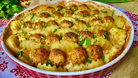 - Потом на каждую дольку уложить фрикадельку.