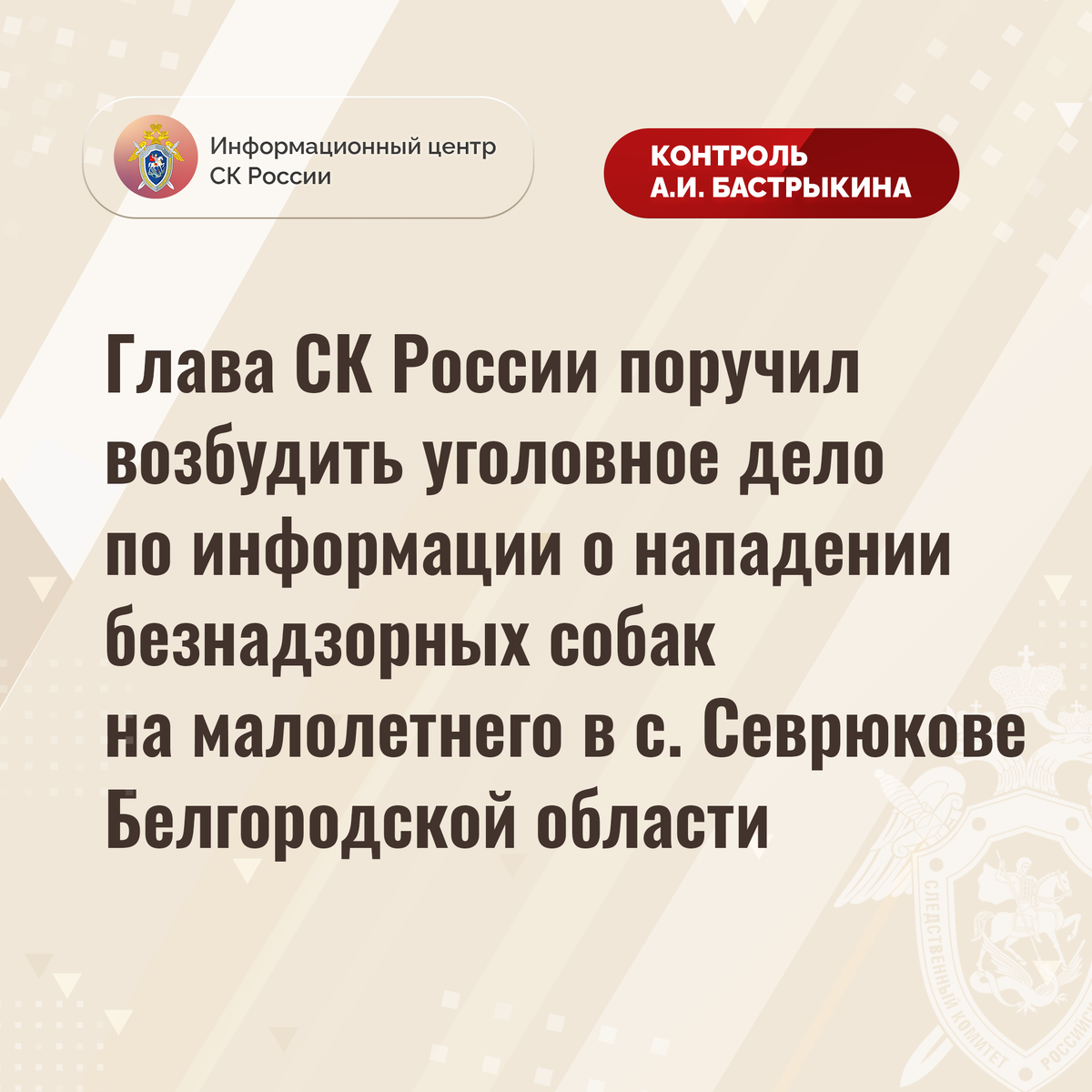 Глава СК России поручил возбудить уголовное дело по информации о нападении безнадзорных собак на малолетнего в с. Севрюкове Белгородской области В СМИ сообщается о нападении бродячих собак на семилетнего мальчика в селе Севрюково Белгородской области. В декабре текущего года агрессивные животные набросились на ребенка. Пострадавшему потребовалась медицинская помощь. Отмечается, что в населенном пункте обитает большое количество безнадзорных собак, однако мер к организации их отлова не принимается. В СУ СК России по Белгородской области организована процессуальная проверка. Председатель Следственного комитета Российской Федерации Александр Иванович Бастрыкин поручил руководителю СУ СК России по Белгородской области Станиславу Александровичу Захарову возбудить уголовное дело и представить доклад о ходе и результатах его расследования. Исполнение поручения поставлено на контроль в центральном аппарате ведомства. #СледственныйКомитет #СКРоссии #СКР #ИЦСКР #ИнформационныйЦентр #АлександрБа