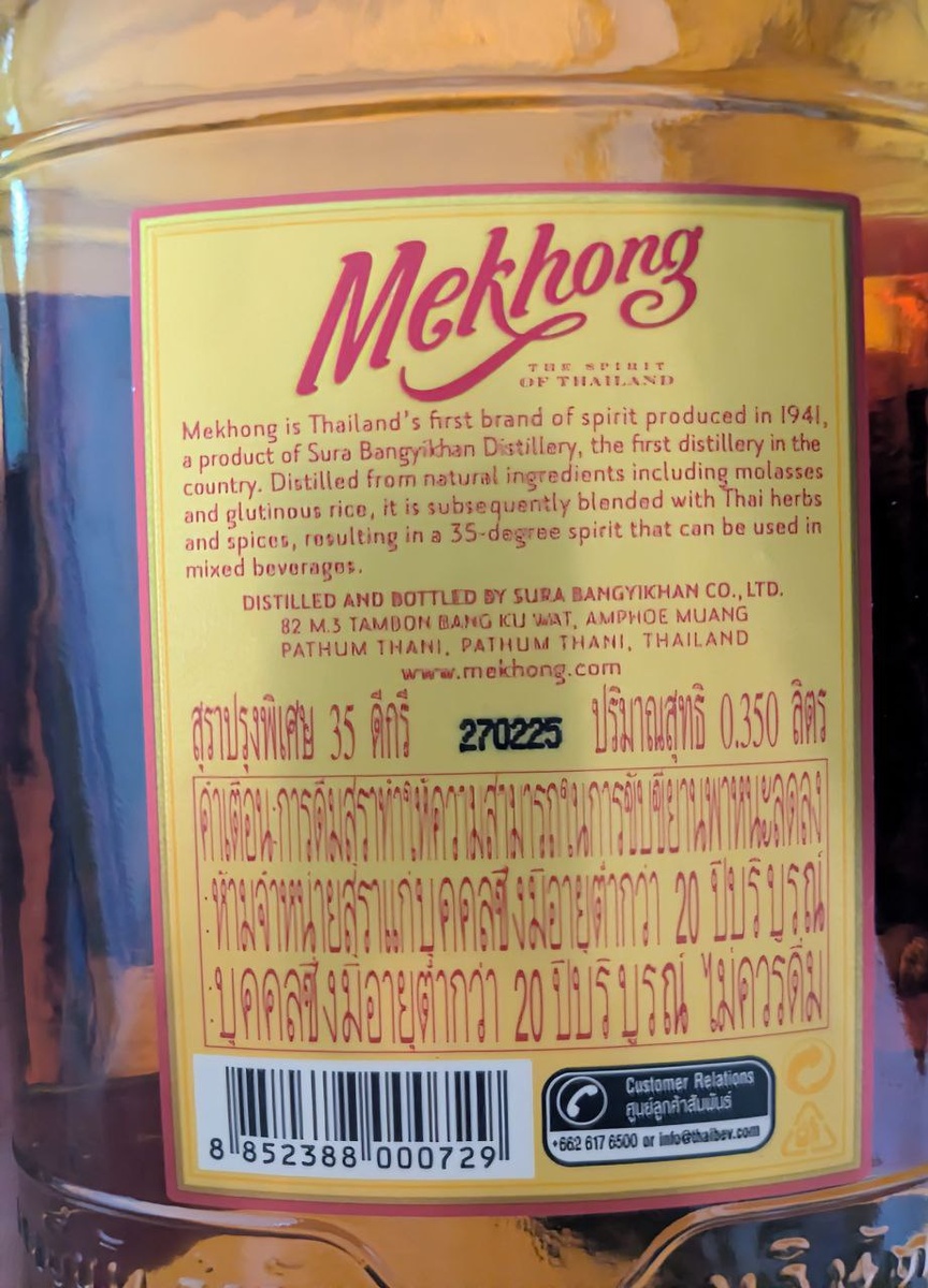 Хотел поставить на третье место Меконг, который я никогда не пил, но слышал, его очень хвалят олдфаги, бывавшие в Таиланде ещё 80-х. Но вот перед отъездом я его попробовал, и должен сказать - удивлен. Ставлю Меконг на первое место рядом с Санг Сомом. Теперь они соседствуют. Если Санг Сом экзотичен просто как ром, сделанный не на Карибах, а в Тае, то Меконг печатляет своим вкусом. Это что-то вроде Tiger balm из мира спиртного. Аромат Таиланда. Меконг делают из смеси рисового и тростникого спирта с добавлением тайских пряных трав. Классный напиток в сочетании со сладким манго. Как впрочем и оба предыдущих. Но заменить Хеннесси мне ими не удалось.