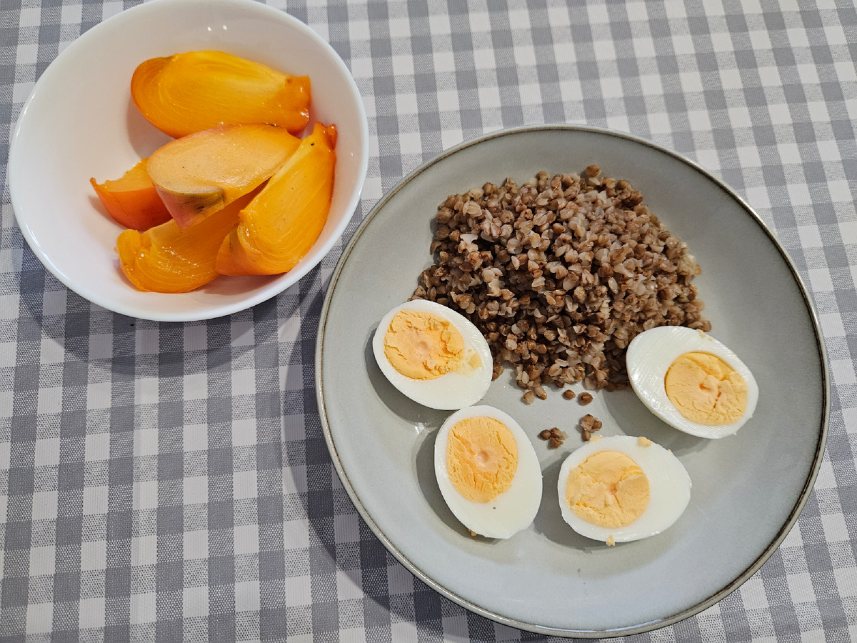 По аналогии с подборкой ужинов показываю, что я ела на завтрак. Для меня завтрак - главный приём пищи. Я могу легко пожертвовать сном в пользу завтрака, если впереди сложный день. Чаще всего мы едим молочную кашу с яйцами в разных видах, но тут я постаралась собрать более разнообразные варианты. Завтрак "разогреть и готово". Гречка, варёные яйца и хурма. Многие говорят, что они не будут с утра ничего готовить - а здесь всё можно сделать с вечера, даже яйца почистить и нарезать (и убрать в герметичный контейнер). Останется только крупу подогреть. Просто творог с йогуртом. Для меня такое не сильно сытное, но бывает, что я встаю по выходным сильно раньше мужа - пока он отсыпается, я завтракаю чем-то лёгким, а уже попозже мы едим основательно. Вот в день с творогом завтрак был таким - судя по естественному свету, это ближе к обеду :) Булгур с молоком, финики и порошковый японский чай с молоком. Омлет с гречкой и овощи. Те же яйца, только в профиль. Можно омлет и с хлебом, но мне будто б