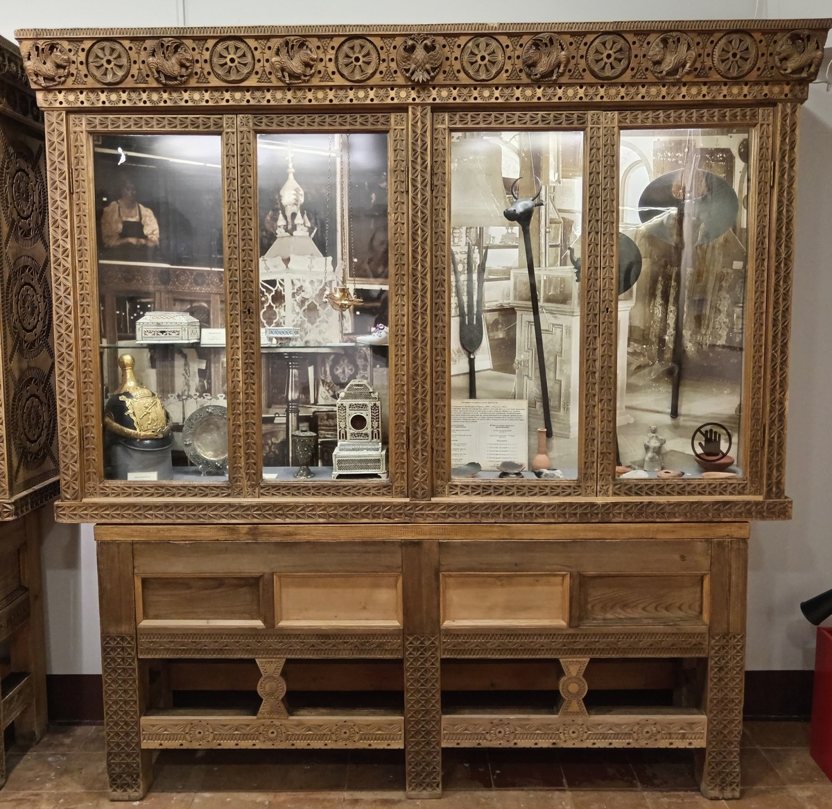 Витрина конца XIX века, изготовлена в Ярославских мастерских для первой экспозиции музея. Прообразом витрин послужил свечной ящик из Ростовского музея (см. фото в комментариях). Именно с него были взяты мотивы и орнаменты для витрин Угличского и Ростовского музеев.