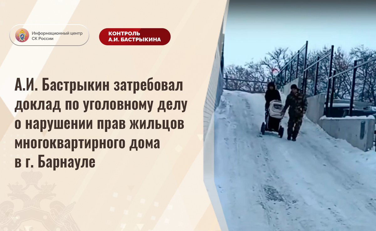 А.И. Бастрыкин затребовал доклад по уголовному делу о нарушении прав жильцов многоквартирного дома в г. Барнауле В социальной сети сообщается о нарушении прав жильцов многоквартирного дома на улице Петра Сухова в городе Барнауле. Здание введено в эксплуатацию в прошлом году, однако благоустройство территории и входных групп, а также строительство парковки приостановлены в связи с банкротством застройщика. Из-за отсутствия пандуса граждане вынуждены пользоваться спуском для автомобилей, что небезопасно. В ноябре текущего года на склоне упала женщина, получив травмы. Отмечается, что одна из семей, воспитывающих ребенка-инвалида, несмотря на приобретение жилья на втором этаже, не могут вселиться, так как территория дома не приспособлена для передвижения лиц с ограниченными возможностями здоровья. В СУ СК России по Алтайскому краю возбуждено уголовное дело. Председатель Следственного комитета Российской Федерации Александр Иванович Бастрыкин затребовал у руководителя СУ СК России по Алтай