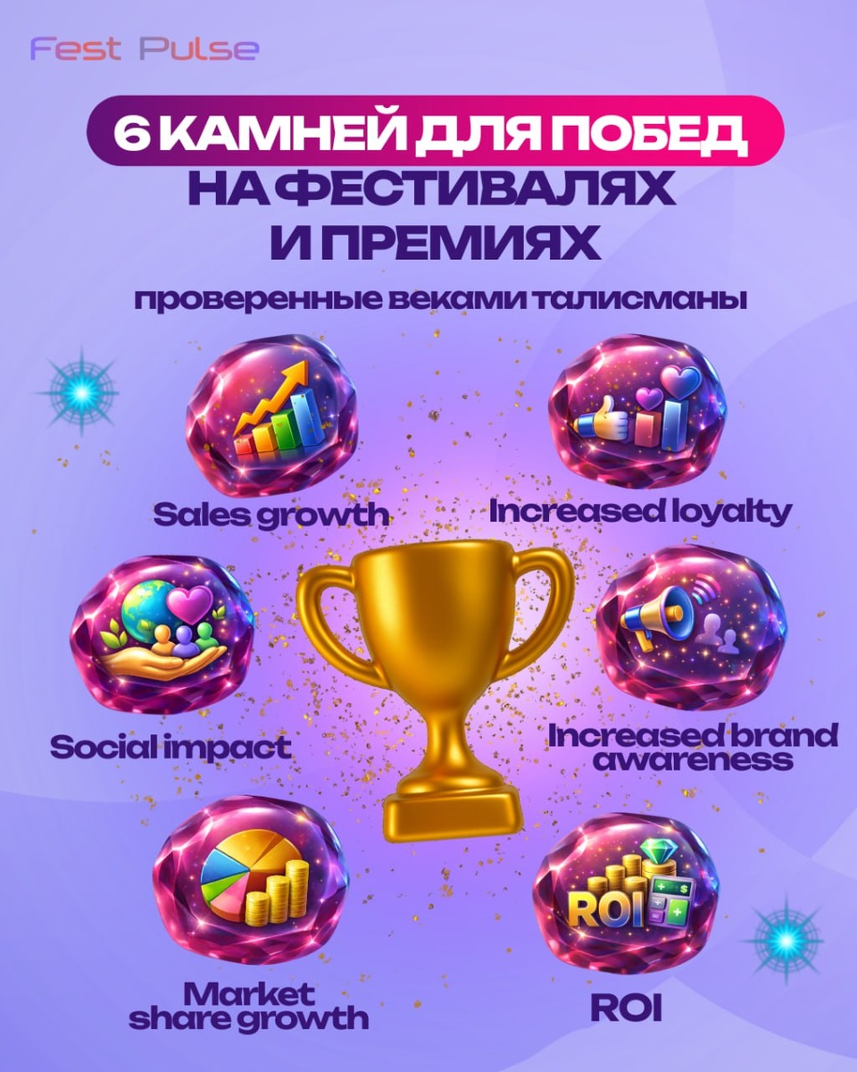 В этот предпраздничный период команда Fest Pulse открыла древний сундук с фестивальными артефактами — талисманами для побед на премиях и фестивалях... 🏆Только взгляните на это! ⭐️ Сразу предупреждаем: никакой тёмной магии и быстрых чудес. Основное волшебство по-прежнему заключено в силе кейса, идее и защите проекта. Именно на это талисманы и настраивают. Они усиливают акценты, подсвечивают главные метрики и добавляют истории нужное сияние 💜💜 Пусть в новом году талисманы работают в полную силу, кейсы говорят сами за себя, а удача приходит не случайно, а по всем правилам фестивального волшебства✨