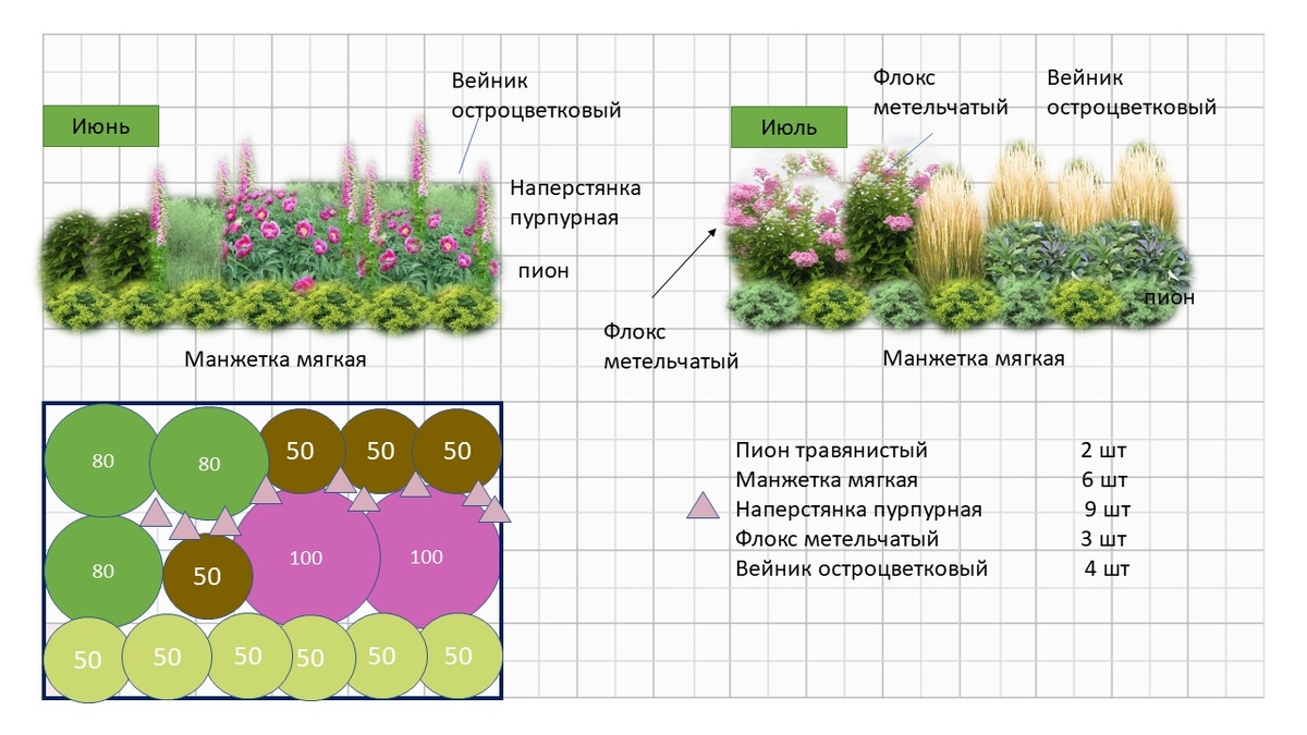 Классика под модной вуалью. Схема цветника с пионами и флоксами 2*3м и список растений