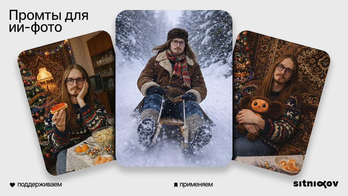 Промт: Используй загруженную фотографию лица в качестве ориентира с сохранением узнаваемости. Создай реалистичный портрет мужчины, сидящего за праздничным новогодним столом, в руках держит хлеб с красной икрой. На нем свитер оверсайз с геометрическими узорами и оленями в стиле 90-х, классические синие джинсы. Действие происходит в уютной квартире советских времен 1990-х годов в СССР, украшенной к Новому году мишурой и гирляндами. На праздничном столе: традиционный салат Оливье в стеклянной миске, очищенные мандарины, бутылка советского шампанского с классической этикеткой, разнообразные советские конфеты и шоколадный конфетный набор, тарелки, вилки и хрустальные бокалы, характерные для 1990-х годов. Детали интерьера: украшенная советская рождественская елка со стеклянными украшениями и мишурой, ковер на стене, украшенный мишурой, деревянный буфет с хрустальной посудой, старый телевизор 1990-х годов выпуска, теплое желтое освещение, создающее уютную вечернюю атмосферу, обои с легким цве