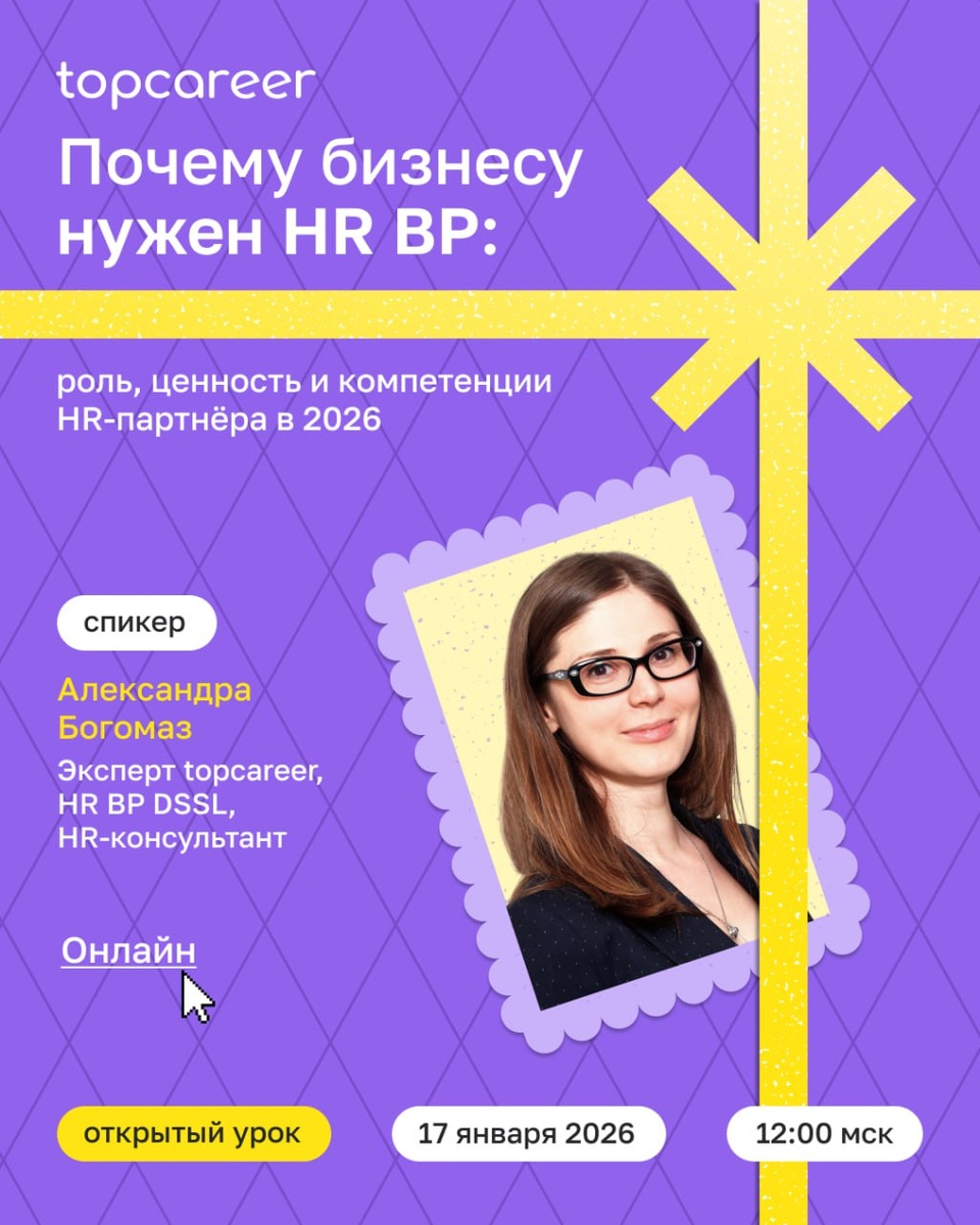 ! Давайте начнем новый профессиональный год правильно и встретимся на нашем первом в 2026 году открытом уроке ▶️ Почему бизнесу нужен HR BP: роль, ценность и компетенции HR‑партнёра в 2026 🕰 Когда: 17 января 2026 года в 12:00 мск 💭 Спикер: Александра Богомаз — эксперт topcareer, HR BP DSSL, HR-консультант ЧТО РАЗБЕРЕМ: 🧎♀️ Как HR-бизнес-партнёр стал ключевым игроком, который соединяет бизнес-цели и людей, формируя эффективные решения вместо просто «HR-функций» 🧎 Зачем бизнесу нужен HR BP: почему компании требуют партнёра, который понимает логику бизнеса и умеет адаптировать под это HR-процессы 🧎♂️ Ключевые компетенции HR BP в 2026 году: какие hard- и soft-скиллы делают HR BP востребованным: аналитика и AI-инструменты, фасилитация, влияния и работа с данными Бронируйте слоты в календарях, чтобы начать год с пользой 💎 ▶️ ЗАРЕГИСТРИРОВАТЬСЯ 📌 За регистрацию подарим Гайд: На каком уровне вы сейчас как HR BP и как вырасти в роли