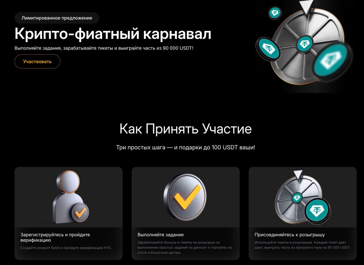 Bybit запустил Крипто-фиатный карнавал: выполняешь простые шаги (регистрация, KYC, первый депозит и трейд) и получаешь тикеты на розыгрыш из 90 000 USDT. Как это работает: Регистрируешь аккаунт и проходишь верификацию личности. Вносишь от 20 USDT через P2P, Fiat Deposit или One-Click Buy и покупаешь первую крипту. Делаешь спот-сделку от 100 USDT и получаешь бонусы + тикеты на еженедельные розыгрыши. Что можно выиграть: Подарки до 100 USDT за выполнение задач. Шанс забрать часть из общего призового пула 90 000 USDT в рамках лотереи. Идеальная тема, чтобы зайти в крипту с нуля и сразу получить шанс на нормальный бонус, просто выполняя базовые действия, которые и так нужны каждому новичку.