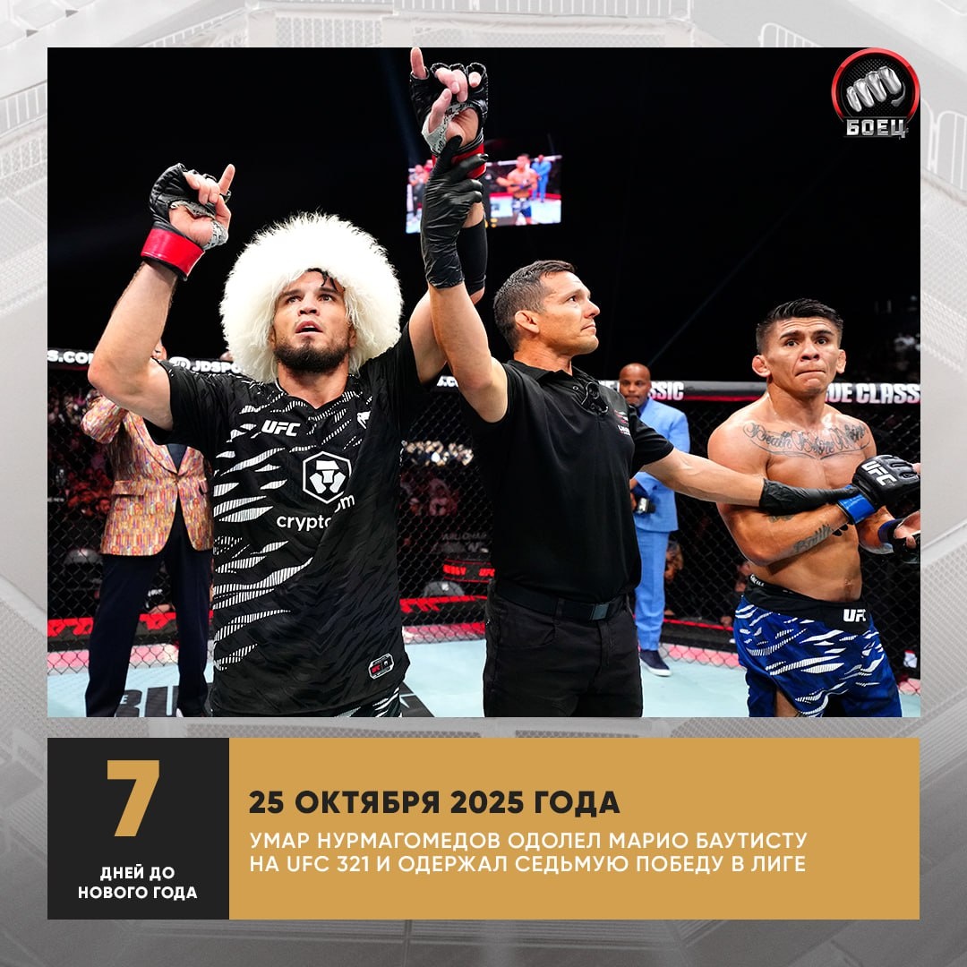 🎄 Продолжаем вспоминать яркие моменты из 2025-го. В октябре Нурмагомедов одолел Баутисту, победив в седьмой раз в UFC 😎 Доберется ли Умар до чемпионского пояса в 2026?