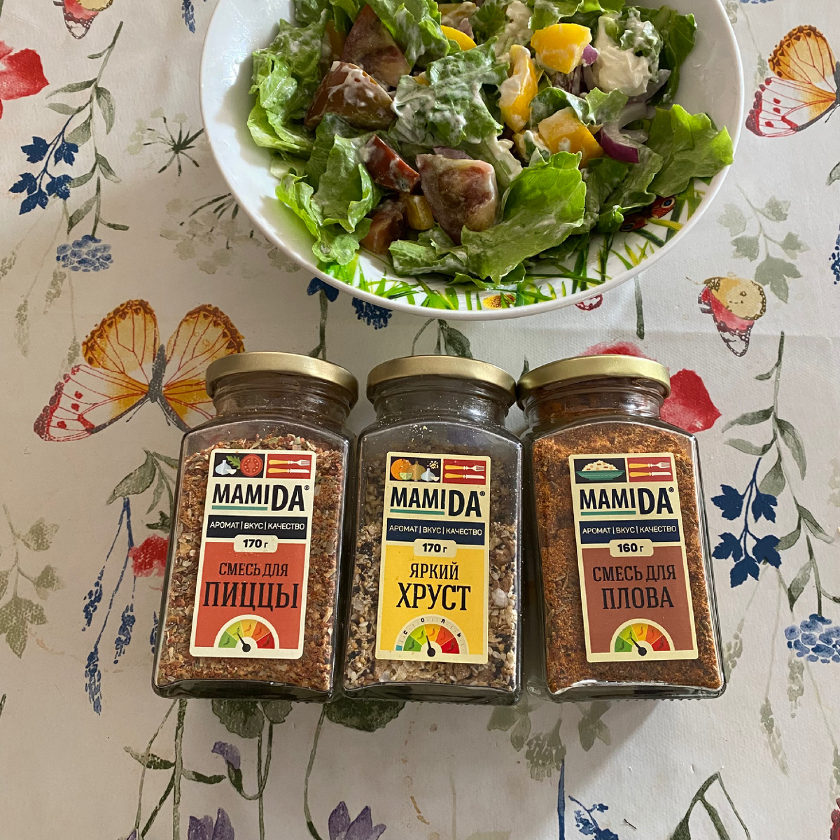 Приправа мамида . Удобные банки, натуральные, вкусно , адекватная цена . Яркий хруст (кунжут, апельсин, жареный лук ) и для пиццы ( базилик, орегано , лук, чеснок, томат) очень удачные, везде добавляю - овощи, рыба, мясо . Для супа не понравилось, слишком мелкий помол - люблю лопухи в супе 🤣👍 . У меня 170 гр арт 145449895 и 228464157 .