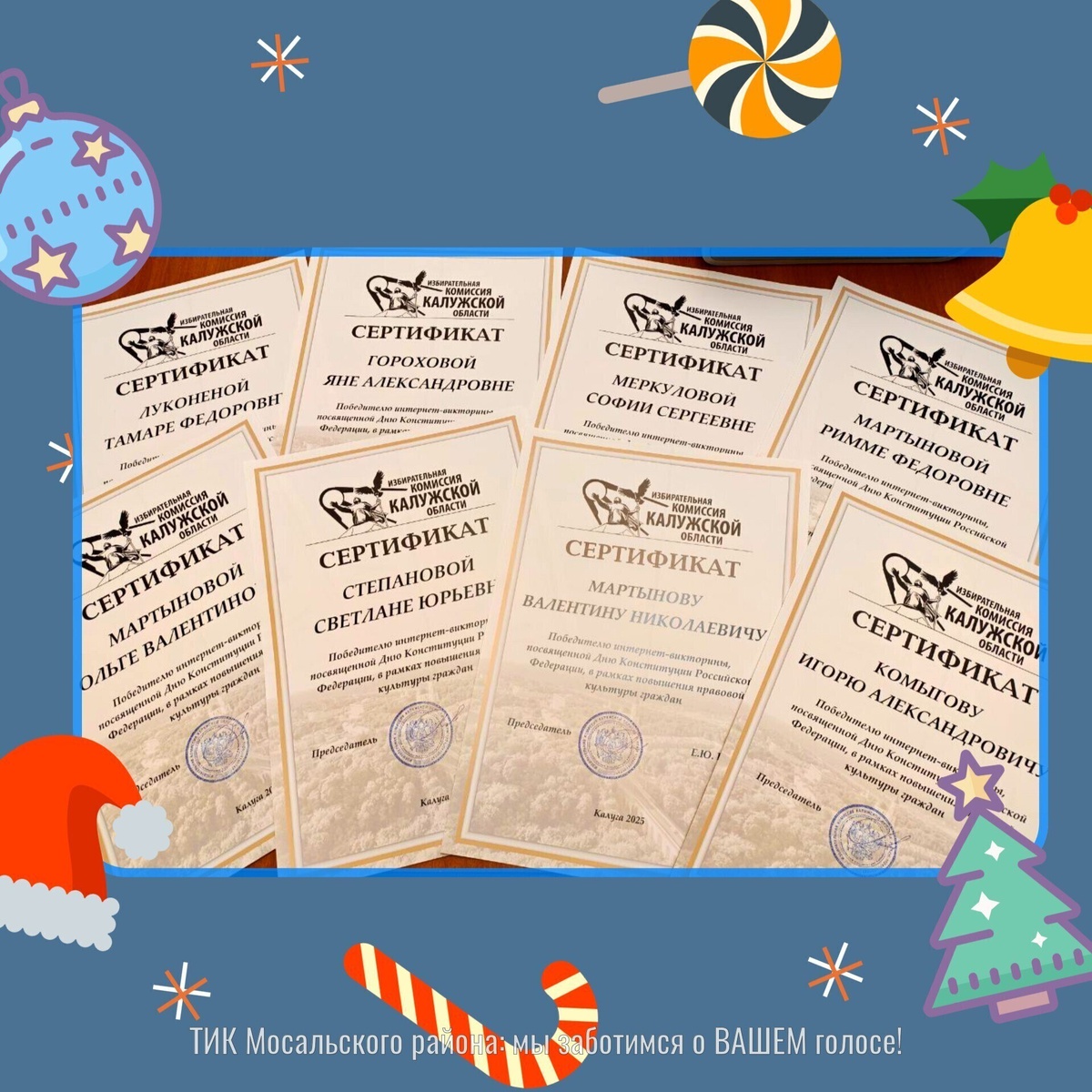 участие 583 человека. 💥Мы несказанно рады, что победители, которые первыми правильно ответили на 25 вопросов викторины, все представители Мосальского района. Победители: 🏅 Горохова Яна; 🏅Комыгов Игорь; 🏅Луконена Тамара; 🏅Мартынов Валентин; 🏅Мартынова Ольга; 🏅Мартынова Римма; 🏅Меркулова София; 🏅Степанова Светлана. Друзья, приглашаем победителей прийти в Мосальскую ТИК по адресу: Мосальск, ул.Советская, 16, каб. 39 для торжественного вручения сертификата победителя и ценного приза🎁 #ТИКМосальскогорайона Наш канал в МАХ