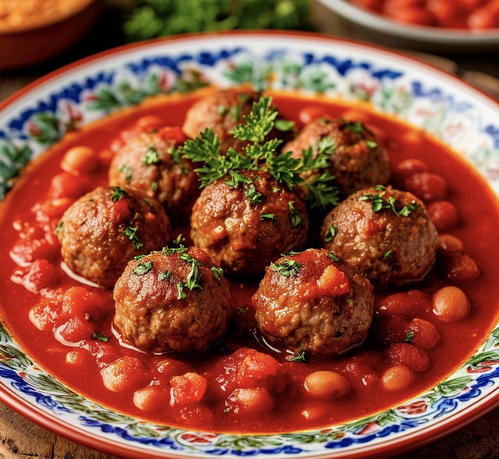 Сытное блюдо с ярким характером — испанские фрикадельки в ароматном томатном соусе с тушёной фасолью. Сочные мясные шарики, сладковатый перец, копчёная паприка и нежная фасоль создают идеальный баланс вкусов. Готовится просто, а результат впечатляет! Время приготовления: 50 минут