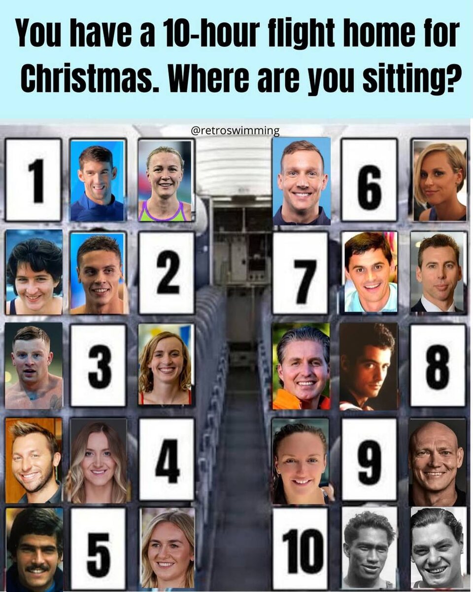 Где вы будете сидеть?» Облегчим вам задачу: 1️⃣Michael Phelps and Sarah Sjöström 2️⃣David Popovici and Dawn Fraser 3️⃣Adam Peaty and Katie Ledecky 4️⃣Ian Thorpe and Katarzyna Wasick 5️⃣Mark Spitz and Ariarne Titmus 6️⃣Caeleb Dressel and Federica Pellegrini 7️⃣Alexander Popov and Grant Hackett 8️⃣Pieter van den Hoogenband and Matt Biondi 9️⃣Michael Klim and Katinka Hosszú 1️⃣0️⃣Duke Kahanamoku and Johnny Weissmuller Варианты ждем в комментариях 🔽 📸Retro Swim