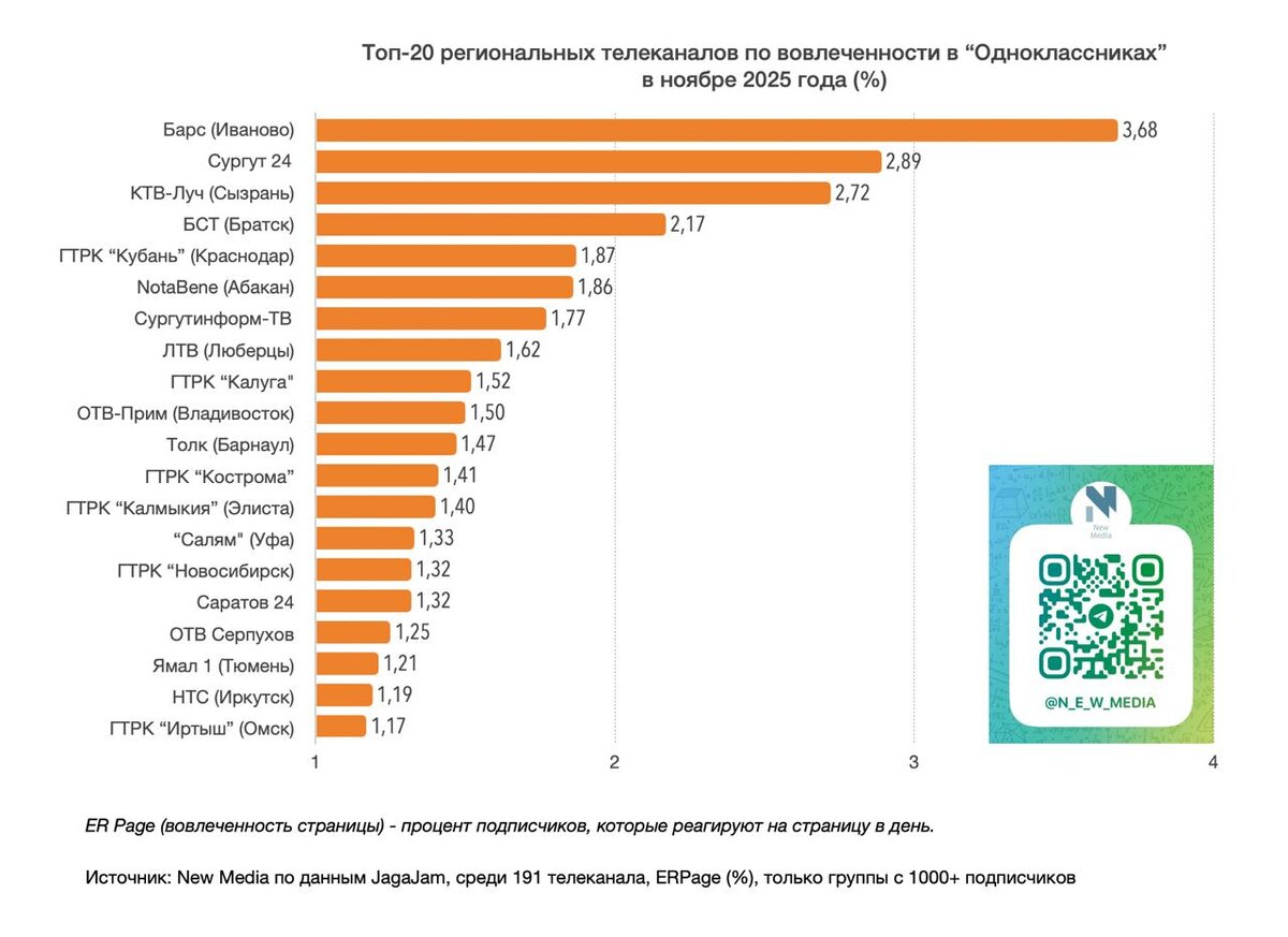 По вовлеченности (ER Page%) 1️⃣ Барс (https://dzen.ru/id/5b56152629c67f00a83ef2a9) (Иваново) - 3.68% 2️⃣🆕 Сургут 24 (https://t.me/omedia24) - 2.89% 3️⃣⬆️ КТВ-Луч (https://t.me/ktv_ray) (Сызрань) - 2.72% 4️⃣🆕 БСТ (https://t.me/bst24bratsk) (Братск) - 2.17% 5️⃣🆕 ГТРК “Кубань” (https://dzen.ru/id/5cfa34c9aff15000afe554fc) (Краснодар) - 1.87% По реакциям (тыс.) 1️⃣ “360” (https://t.me/joinchat/AAAAAD5fgqi8VPHFO73i9g) (Моск. область) - 134.8 2️⃣ Москва 24 (https://t.me/infomoscow24) - 115.1 3️⃣ Барс (Иваново) - 56.8 4️⃣ Кубань 24 (https://dzen.ru/id/59e6feee55876b585a47d777) (Краснодар) - 25.1 5️⃣🆕 NotaBene (https://dzen.ru/id/5b6168ae9c6ae100a9a29500) (Абакан) - 18.4 По подписчикам (на конец ноября, тыс.) 1️⃣ "360" (Моск. область) - 760.1 2️⃣ Москва 24 - 669.2 3️⃣ Кубань 24 (Краснодар) - 115.7 4️⃣ 12 канал (https://t.me/kanal12omsk) (Омск) - 98.7 5️⃣ ЛенТВ24 (https://t.me/lentv24) (Ленобласть) - 90.9 Источник: New Media (https://dzen.ru/id/5e76f21f222104185bb32c45) по данным JagaJam