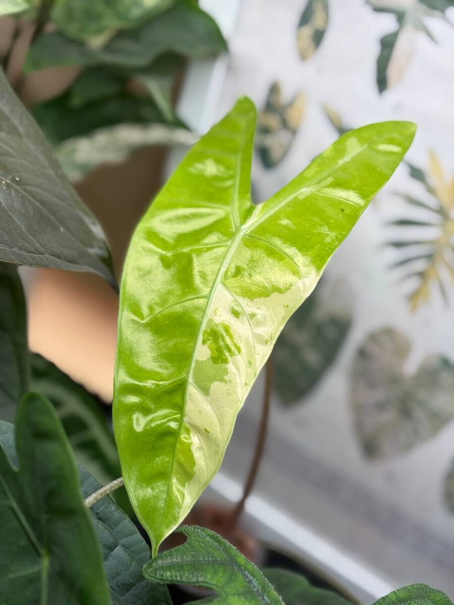 Alocasia Longiloba lemon lime после нескольких почти полностью зеленых листьев дала вот этот невероятно яркий лист 🥳