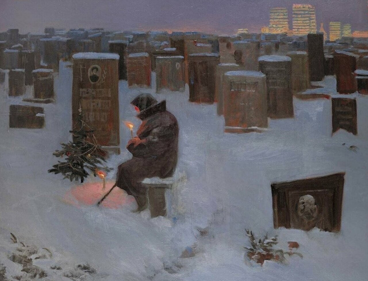История этой картины не аллегория и не художественный вымысел. Андрияка услышал её случайно — от попутчицы в автобусе. Женщина рассказала, что потеряла единственную дочь и с тех пор каждый Новый год проводит на кладбище. Не потому, что не может жить дальше, а потому что иначе праздник теряет для неё смысл.
