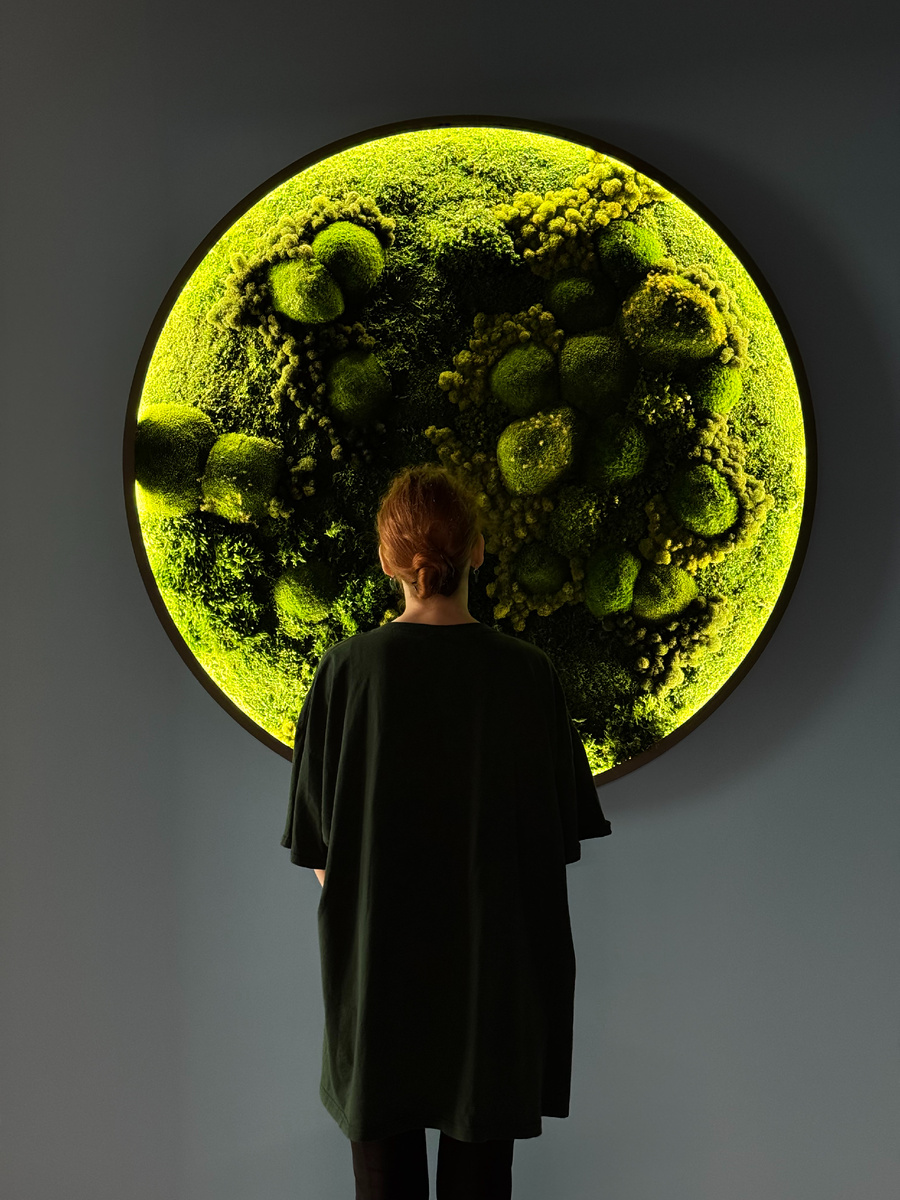 Лёгкая LED-подсветка усиливает глубину цвета мха и делает пространство уютным.
