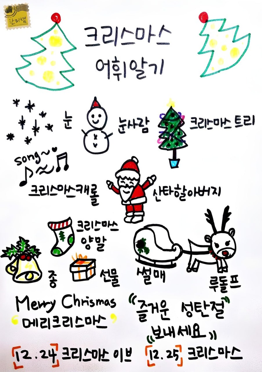 💕 메리 크리스마스~ [мэри кхырисымас] 눈[нун] – снег 눈이 내려요[нуни нэрёё] – идёт снег 눈사람[нунсарам] – снеговик 크리스마스 트리[кхырисымас тыри] – рождественская ёлка 크리스마스 캐롤[кхырисымас кхэроль] – рождественская песня 산타할아버지[санта харабоджи] – Санта Клаус 산타할아버지 오시네 – К нам едет Санта! 루돌프[рудольпхы] – Рудольф 루돌프는 빨간코를 가진 순록이다 – Рудольф, это северный олень с красным носом. 순록[술록/суллок] – северный олень 종[чонъ] – колокольчик 종소리[чонъсори] – звон колокольчика 선물[сонмуль] – подарок 양말[янъмаль] – носки 썰매[ссольмэ] – сани 리스[рисы] – венок, который является популярным украшением на рождество 장식품[чанъщикпум] – украшения (для оформления) 양초[янъчо] – свеча #слова