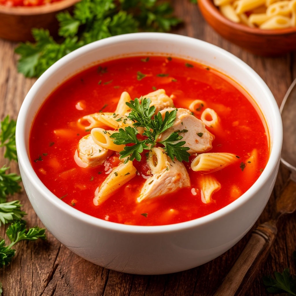 Яркий, ароматный и удивительно сбалансированный — этот томатный суп с кусочками нежной курицы и макаронами станет вашим любимым вариантом для семейного обеда. Кисло‑сладкий томатный вкус, пряные травы и сочное куриное мясо создают гармоничное блюдо, которое согреет и насытит. Время приготовления: 60 минут