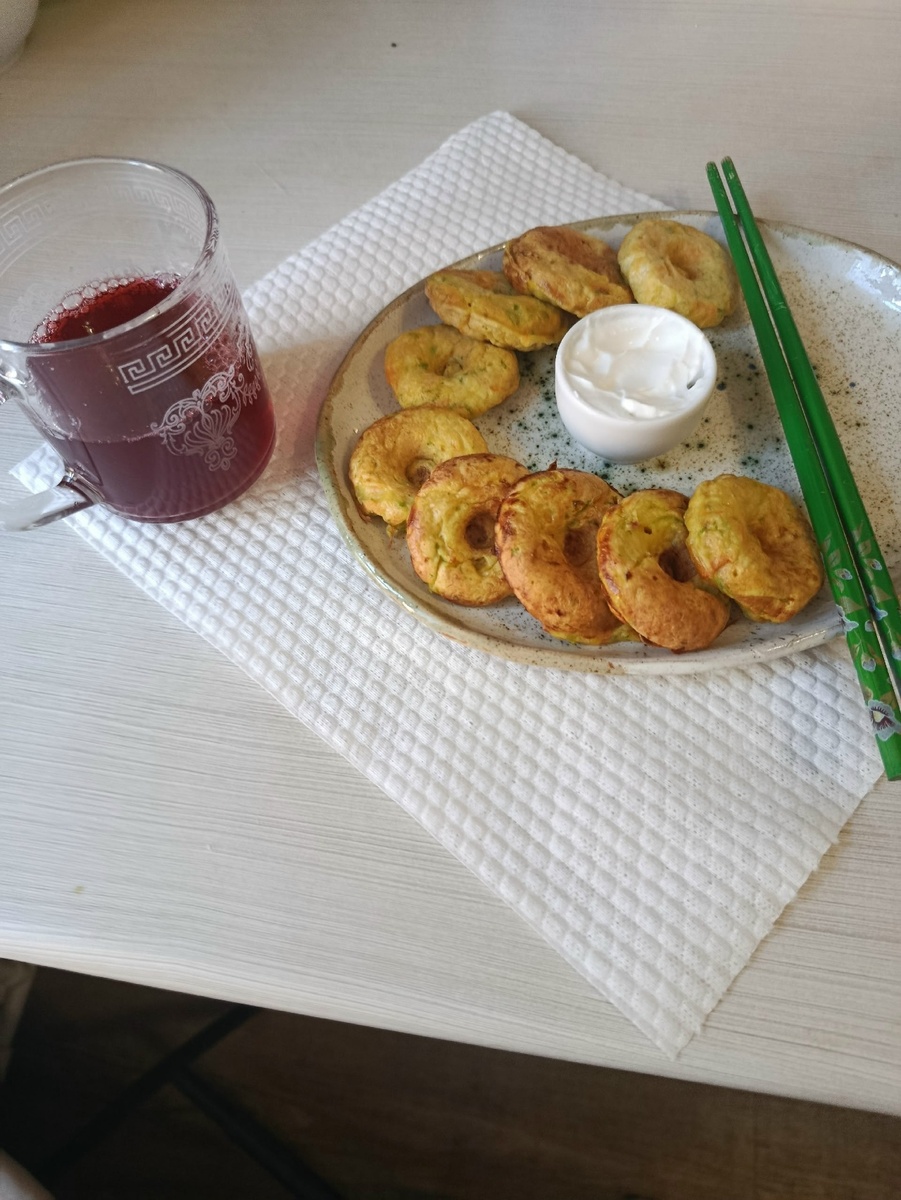 Всех приветствую на своем канале. День сегодня солнечный, но холодный. На градуснике в семь утра было плюс три градуса. Я с утра решила побаловать себя вкусняшками. Но в моём положении вкусно и полезно это не так уж и просто. Я вспомнила что у меня есть чудо техника. Если вы думаете, что это простая вафельница, вы ошиблись. Это чудо называется минипекарня. У неё больше двадцати сменных насадок, но у меня пока что только пять штук. Но и этих хватает, чтобы разнообразить меню. Сегодня я решила испечь необычные пончики из трёх ингредиентов. Морковь, кабачок и яйцо. Немного, всего три ложки, добавила муки и щепотку соли. Морковь потёрла на мелкой тёрке, кабачок немного покрупнее. Не отжимала, добавила яйцо, муку и соль. Вставила насадку для пончиков. И вот что получилось Уселась завтракать, подачу сделала как в ресторане! Это было восхитительно!