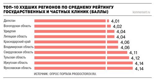 Это Дагестан (3,19), Владимирская (3,37), Иркутская области (3,45), Удмуртия (3,40). За счет высоких оценок частного сектора этот провал компенсируется в общем зачете (4,75–4,85). А вот Краснодарский край — уникальный антилидер. При большом количестве отзывов — 96 тыс.— он показывает самый низкий рейтинг частных клиник среди всех крупных регионов (4,37) и средний — по государственным (3,75). Москва и Санкт-Петербург со средним рейтингами 4,5 и 4,43 находятся в середине списка регионов с большим количеством отзывов.