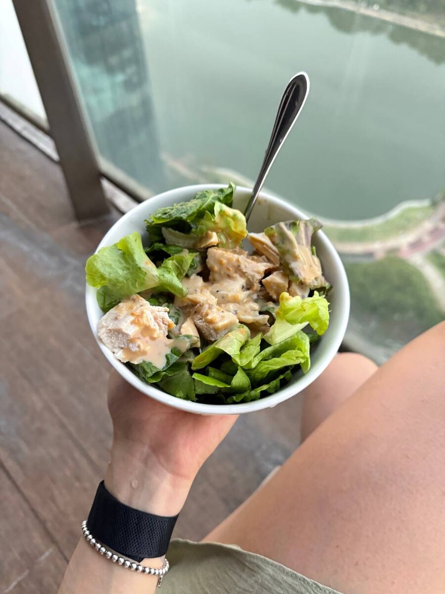 Тут листья, куриная грудка то ли сувид, то ли просто вареная и кунжутная заправка.