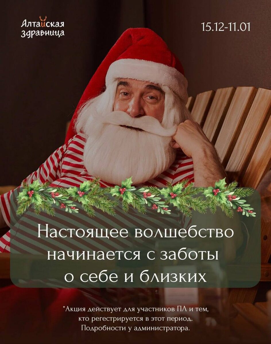 🎅 Говорит, в Великом Устюге Алтайской здравницы нет, а раз уж оказался поблизости - упускать такую возможность нельзя. Для себя он выбрал программу «Сибирский дух» 🌿 Прогрелся в фитосауне, а затем отправился на общий массаж с особым вниманием к шее и спине - ведь носить мешок с подарками детям задача не из лёгких. Говорит, после процедуры борода стала мягче, походка - легче, а настроение - по-настоящему праздничным ✨ 🎁 А ещё Дед Мороз признался: лучший подарок - это забота и отдых, поэтому приобрел парочку подарочных сертификатов для своих помощников ❄️ Если даже Дед Мороз выбирает такой подарок, значит, вы точно не ошибётесь 🤍 🎄 Подарочный сертификат можно оформить в нашем салоне или онлайн на сайте в пару кликов altayspa.ru 💫