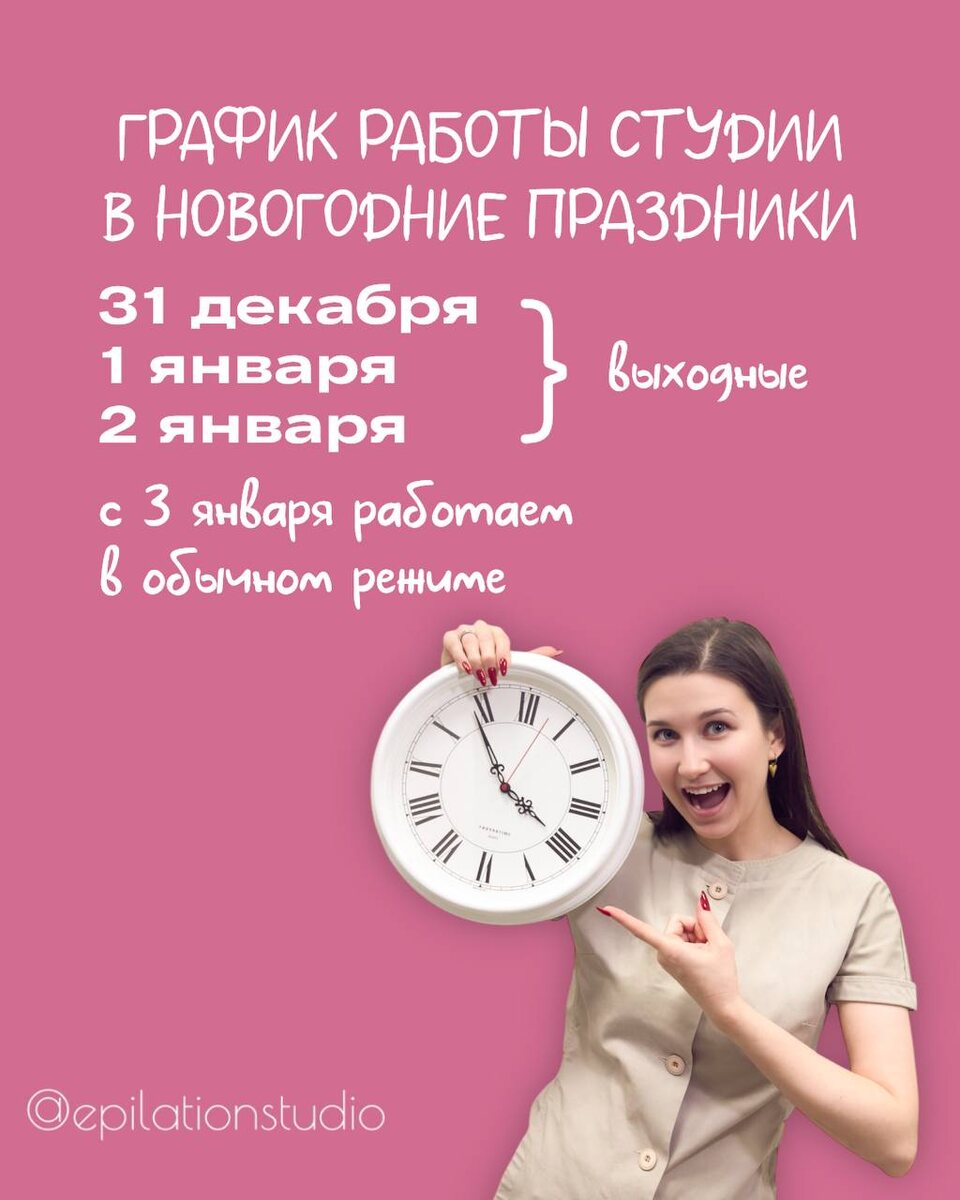 ! ❄️ График работы в новогодние праздники: · 31 декабря, 1 и 2 января — выходные дни ❤️ · С 3 января — работаем в обычном режиме: с 9:00 до 21:00! Что важно знать? · Запись на январь уже открыта! Успейте забронировать удобное время для первой в году процедуры. · Подарочные сертификаты можно приобрести в электронном виде даже в дни нашего отдыха — просто напишите нам в личные сообщения . · С 3 января мы ждём вас в обеих студиях, чтобы начать этот год красиво, гладко и уверенно! Пусть ваши праздники будут тёплыми, а новый год — таким же мягким и комфортным, как ваша кожа после наших процедур! 🥂 С любовью и предвкушением чуда, ваша студия @epilationstudio
