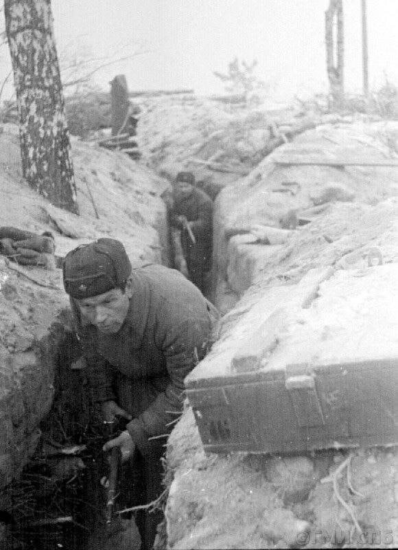 Советские солдаты подходят к передовому рубежу - подходы к переправе через реку Неву на плацдарм "Невский пятачок". 1942 г.
