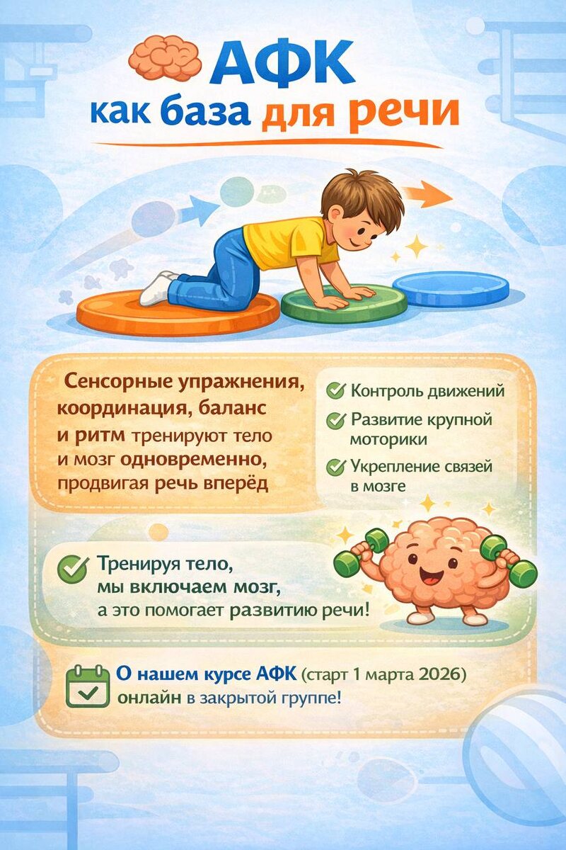 Вы замечали, что у детей с РАС и сенсорными трудностями часто возникают задержки в речи? Часто причина не только в мозговых процессах, но и в нарушениях моторики и координации. На занятиях по адаптивной физической культуре (АФК) мы тренируем тело и мозг одновременно: сенсорные упражнения, координация, баланс и ритм помогают детям лучше контролировать движения, а это напрямую связано с развитием речи. 💡 Чем сильнее ребёнок «включается» в упражнения, тем проще ему формулировать слова, строить фразы и понимать инструкции. 📅 Подробно эти принципы мы разбираем на нашем курсе АФК (старт 1 марта 2026) — онлайн в закрытой группе, с пошаговыми занятиями и научно обоснованными методиками.