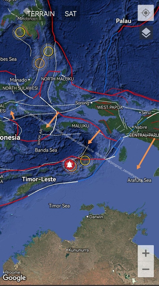 По данной зоне есть вероятность землетрясения сильнее М6.0 до конца года. ===== Northeastern Indonesia has been hit between Papua and Sulawesi. There is a possibility of an earthquake stronger than M6.0 in this area before the end of the year.