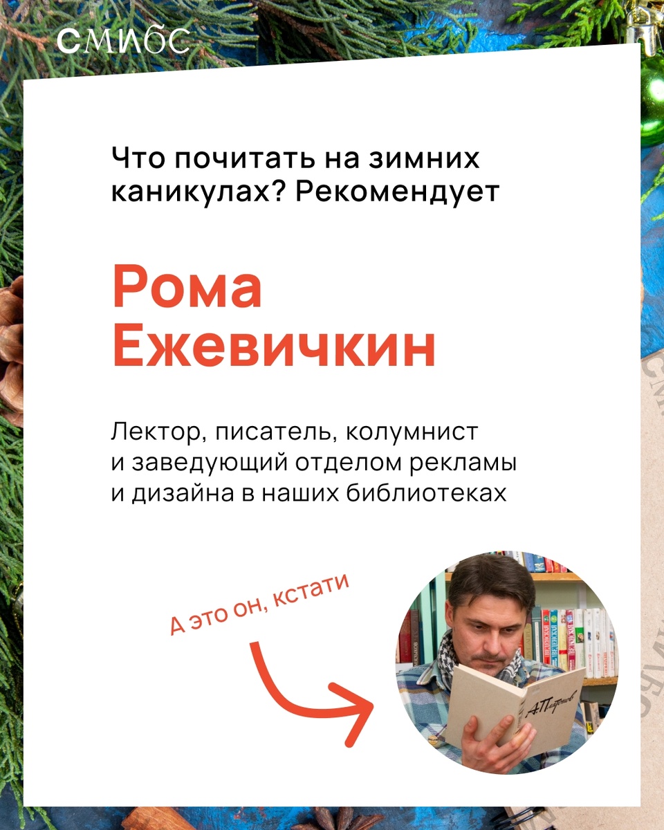 Что почитать на каникулах? Подборка от Ромы Ежевичкина, лектора, писателя, колумниста и заведующего отделом рекламы и дизайна в наших библиотеках. «Всем привет. Моя подборка больше познавательная, чем развлекательная, но если автор умеет рассказывать истории, даже инструкция по замене жиклёра (чтобы это ни было) будет проглочена за одну ночь». Поехали! Размером книга с кирпич, но поставьте себе напоминание не забыть поесть мандаринов и «Оливье». Это история космонавтики от зарождения до 12 апреля 1961 года. Первушин пишет легко, бодро и увлекательно. Сказывается опыт писателя-фантаста. Но книга документальная и захватывает не меньше, чем космические глубины. Не забудьте потом купить шоколада Книга рассказывает про Елену Шпакову, первого директора фабрики «Россия». Выдающаяся женщина, про которую надо кино снимать. Повествование бодрое, с огромным количеством фактов и без лирических отступлений. Читать действительно интересно, а некоторые архивные фотографии так и пышут волжским гедони
