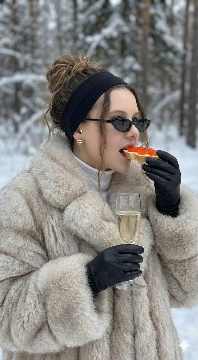 🎄 Промпт 1 - Для девочек Create a photorealistic portrait, strictly preserving the original facial features (no changes to face shape, eyes, nose, lips, proportions, or age). An elegant young woman in a “Slavic Girl” luxury winter aesthetic poses in front of a snow-covered winter forest. Appearance & Hair: The woman has soft, expressive facial features and well-groomed, natural-looking skin. Her expression is calm, confident, and composed. Her hair is wavy, styled into a loose, slightly messy bun, with a few natural strands falling softly to add realism and elegance. She wears round gold earrings, classic in shape, made of warm gold-toned metal with a subtle shine. Clothing & Accessories: She is wearing a luxurious oversized light-colored fur coat, with rich texture and highly detailed fur. Under the coat, she wears a white high-neck turtleneck sweater, clean, minimal, and elegant. On her head, she wears a black headband, neatly positioned and balanced with the hairstyle. On her fac
