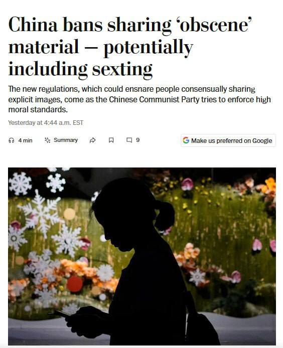 Привет, друзья! Сегодня я хочу поговорить с вами о новости, которая может показаться далёкой и не имеющей отношения к нашей жизни. Но давайте посмотрим глубже и поймём, что подобные изменения могут повлиять на каждого из нас. В Китае с 1 января вступает в силу новый закон, запрещающий пересылку «непристойных» материалов, даже в личных сообщениях. Под запрет попадает и обычный «секстинг» — неважно, было ли это по взаимному согласию. За нарушение грозит до 15 суток ареста и штраф около 55 тысяч рублей. Власти объясняют меру борьбой за «высокие моральные стандарты». Но что это значит для обычных людей? Представьте себе ситуацию: вы обмениваетесь личными сообщениями с близким человеком, и вдруг оказывается, что ваши безобидные, как вам казалось, сообщения могут привести к серьёзным последствиям. Это может вызвать недоверие и страх в отношениях, ведь люди будут бояться высказывать свои мысли и чувства открыто. Кроме того, этот закон может привести к росту цензуры и контроля над личной жизнь
