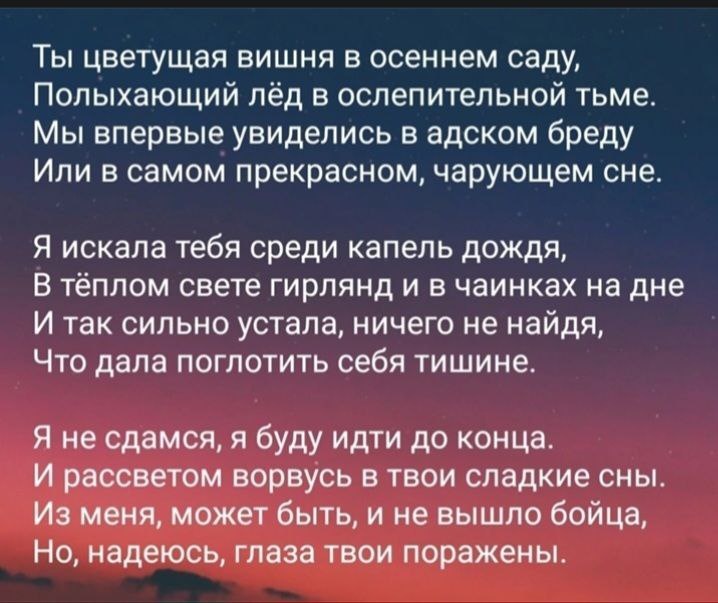 И, казалось бы, на этой печальной ноте стихотворение могло закончиться, но нет. В заключительной строфе читателя ждет прорыв. Сначала героиня позволяет поглотить себя тишине, но, как будто уйдя на дно и оттолкнувшись от него, она выныривает и жадно вдыхает спасительный кислород – она не сдалась, она нашла способ быть с Ним. Для этого она тоже станет потусторонним, магическим, запредельным явлением – она явится к Нему в сладком, рассветном сне и у Него просто не останется шансов перед таким напором.