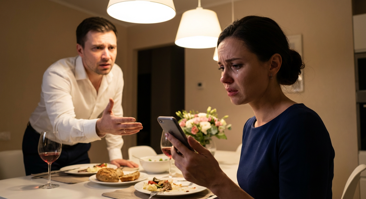 Марина поставила на стол хрустальный салатник с «Цезарем» и выразительно посмотрела на мужа. Павел вздрогнул, словно его ударили током, и поспешно перевернул смартфон экраном вниз. Его лицо на мгновение приняло виноватое выражение, которое тут же сменилось маской нападения.