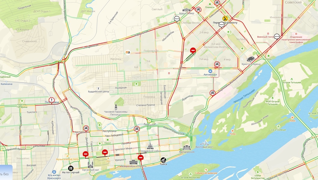 В Красноярске 29 декабря в два часа дня водители встали в предновогодние пробки. Судя по картам 2ГИС, сейчас ситуация на дорогах оценивается в шесть баллов. Хуже всего ситуация на улицах Высотная, Михаила Годенко, Копылова, Маерчака, Республики, Шахтёров, 78 Добровольческой Бригады, Авиаторов и Молокова. Также на некоторых улицах движение затруднено из-за ДТП: Взлётная, 78 Добровольческой Бригады, Мира и Республики. Водители жалуются на скользкие дороги, а некоторые шутят, что стоять в пробках будут до следующего года. фото: 2ГИС.