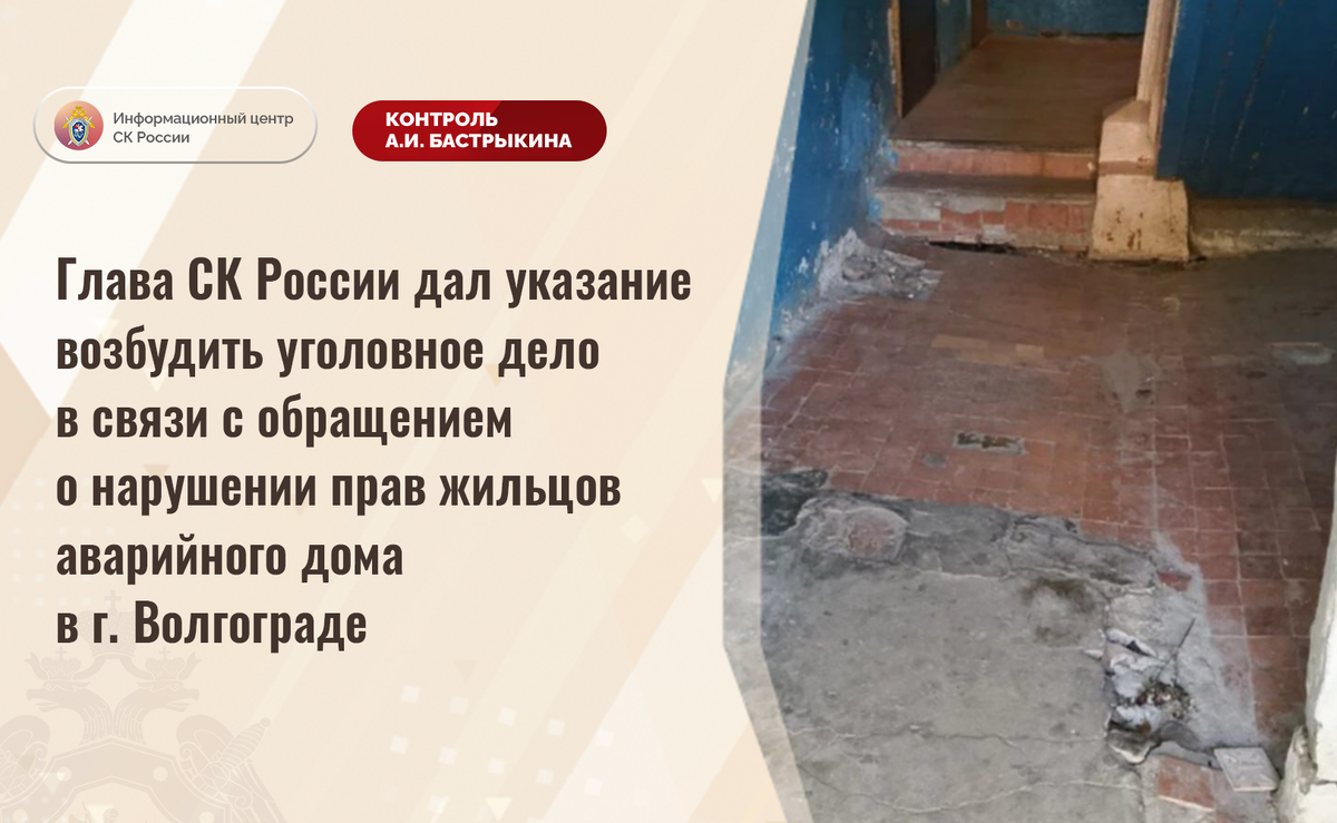 Глава СК России дал указание возбудить уголовное дело в связи с обращением о нарушении прав жильцов аварийного дома в г. Волгограде В Информационный центр СК России поступило обращение по вопросу длительного нерасселения жильцов многоквартирного дома на улице Воронкова города Волгограда. Двухэтажное здание 1951 года постройки из-за высокой степени износа несущих конструкций, а также разрушающихся перекрытий и кровли в 2021 году признано аварийным и подлежащим сносу. Однако до настоящего времени мер к предоставлению гражданам благоустроенных жилых помещений не принимается, установленный срок расселения перенесен. Многочисленные обращения жильцов в компетентные органы результатов не принесли. В СУ СК России по Волгоградской области организована процессуальная проверка. Председатель Следственного комитета Российской Федерации Александр Иванович Бастрыкин дал указание руководителю СУ СК России по Волгоградской области Василию Ивановичу Семенову возбудить уголовное дело и представить докла