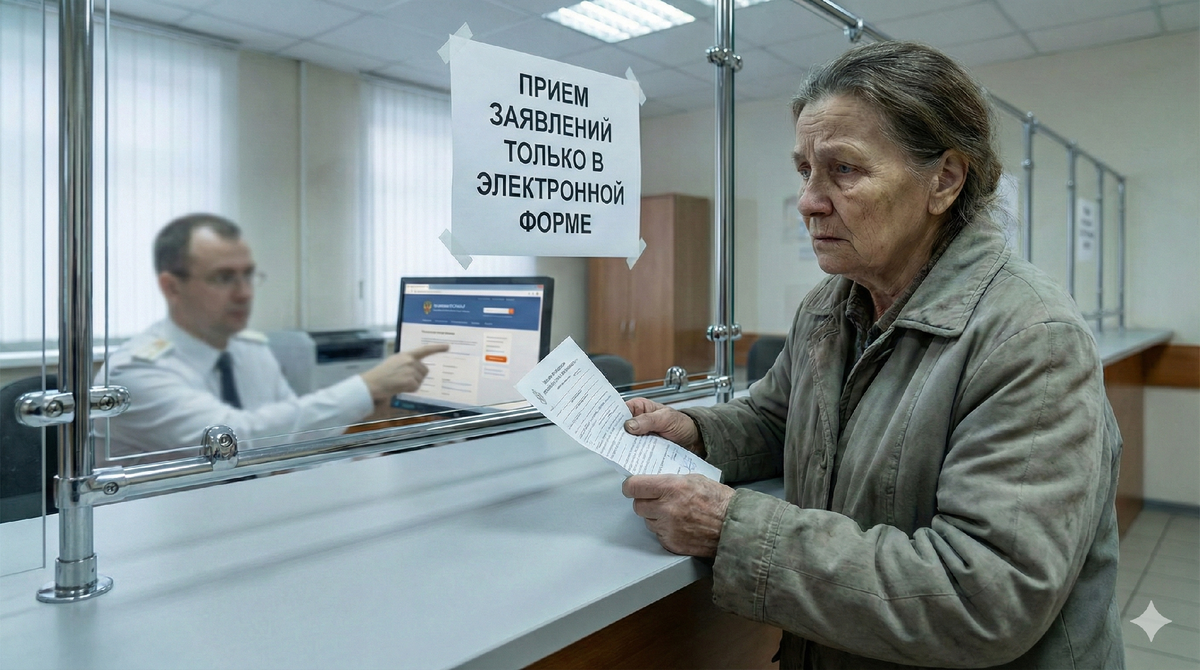 «Извините, бабушка, вы в цифровом веке. Ваше бумажное заявление — это мусор. Идите домой, покупайте смартфон, регистрируйтесь на портале, подтверждайте личность, а если не умеете — это ваши проблемы. Денег не будет».