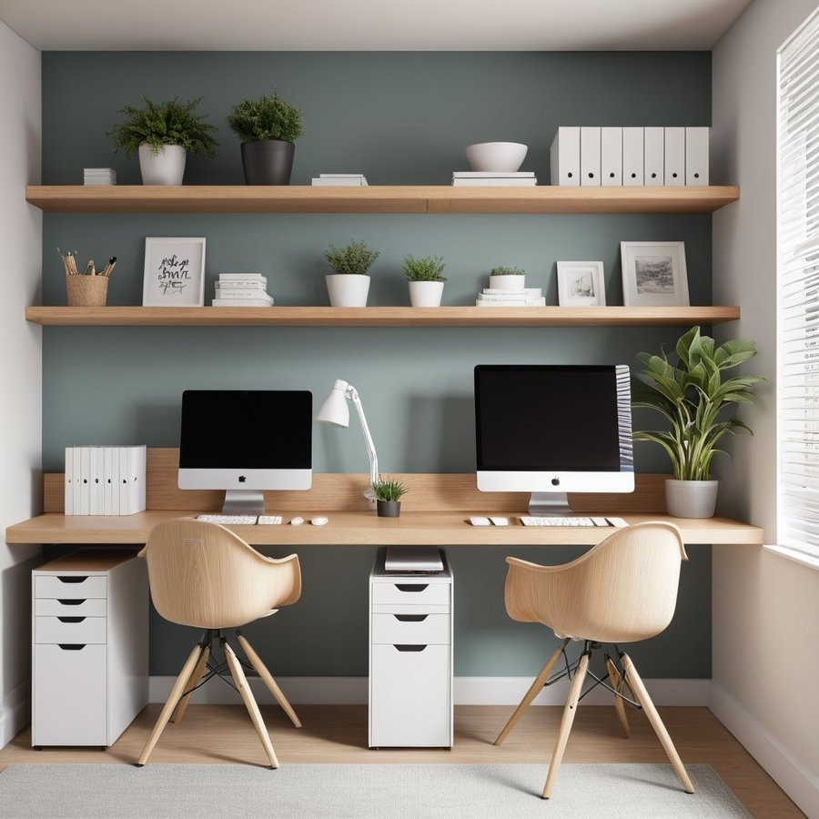 Декор также играет ключевую роль в создании уюта. Растения, настенные часы или светильники помогут сделать пространство более живым и привлекательным. Используйте текстиль - подушки и пледы, чтобы добавить тепла. Хранение вещей должно быть организовано так, чтобы каждый мог легко находить свои принадлежности. Удобные ящики и корзины помогут избежать беспорядка, а стильные органайзеры добавят нотки элегантности и порядка в кабинет, создавая комфорт для обоих.