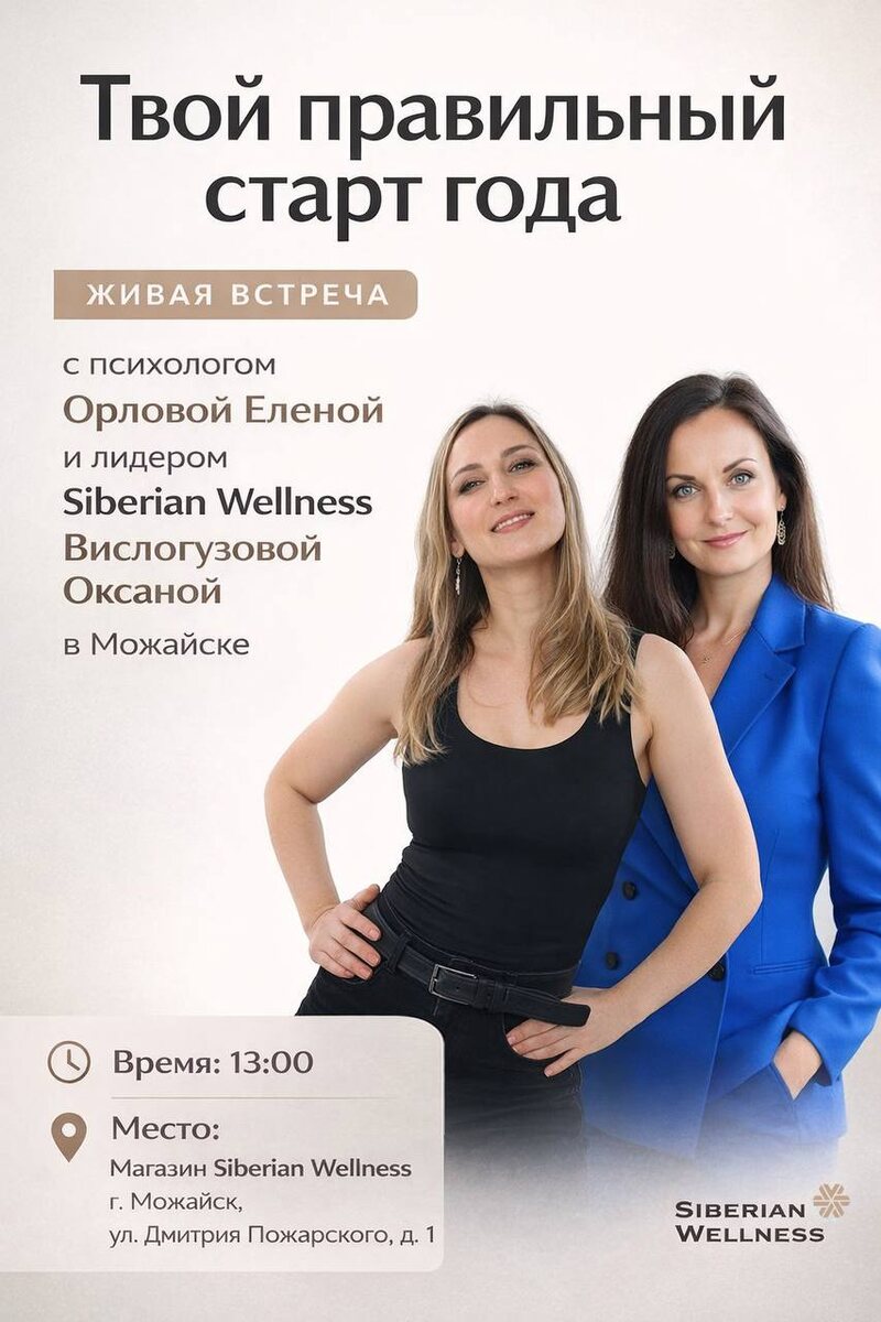 📅 10-го января в 13:00 приглашаю вас на полезную встречу в магазине «Сибирское здоровье» в Можайске 🌿 Я буду приглашённым гостем и проведу практику «Новогодние мешки» ✨ Она помогает: — отпустить всё лишнее из прошлого года — увидеть ценное и опоры — поставить цели так, чтобы они реально начали сбываться. Всем участницам ценные подарки от меня лично ❤️ 🌱 А также вас ждёт полезная информация про здоровье от Оксаны @oxrulit — она расскажет про послепраздничный детокс — как укрепить иммунитет — какие витамины нужны зимой. 🎁 Также всех участников ждут подарки — тест-пакеты с продукцией «Сибирское здоровье» Место: город Можайск, улица Дмитрия Пожарского 1а, первый вход справа, магазин «Сибирское здоровье» Дата: 10 января Время: 13.00 Встреча бесплатная ❤️ ❗️Запись в личные сообщения @Elen_Orlova обязательна