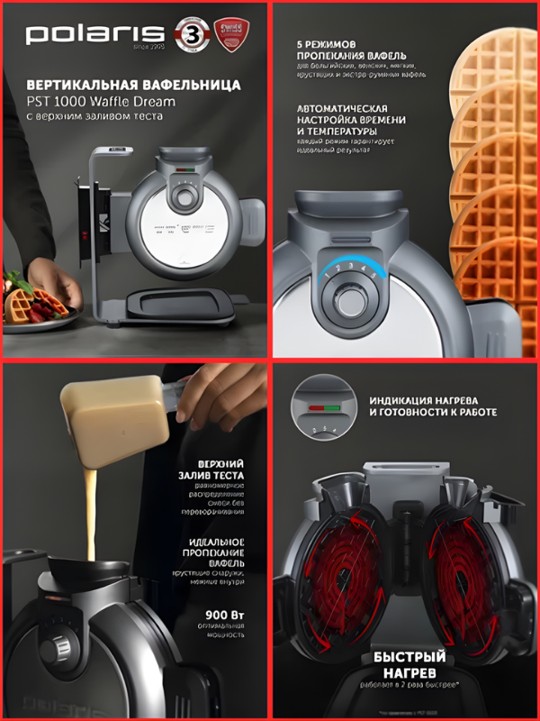 Прибор весит прилично, в руках лежит уверенно. Графитовый корпус — беспроигрышный ход. Он не маркий, скрывает отпечатки пальцев и выглядит дороже своей цены. Такой гаджет не стыдно поставить на стол и подавать вафли прямо с него. Что обещает Polaris и что получаем на деле: Мечта или реальность? Что можно готовить? Самое очевидное — бельгийские классические вафли (толстые, мягкие внутри). Получаются идеально. Но на этом возможности не заканчиваются. Это же пресс с антипригарным покрытием! Экспериментируйте: Для кого этот сон? Polaris Waffle Dream — не must-have, а гаджет для создания настроения. Он не разочаровывает по качеству,