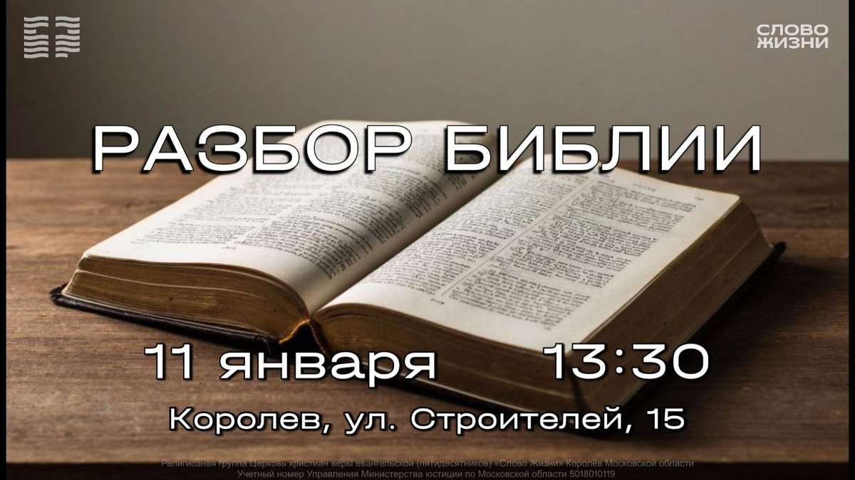 ! В это воскресенье (11 января), пройдет первая в этом году встреча, посвященная чтению и разбору Библии! Мы продолжим читать Книгу Притч! Ждем Вас после служения. Начало в 13:30 Адрес: г. Королев, ул. Строителей, 15 (2 этаж, вход со стороны Wildberries).