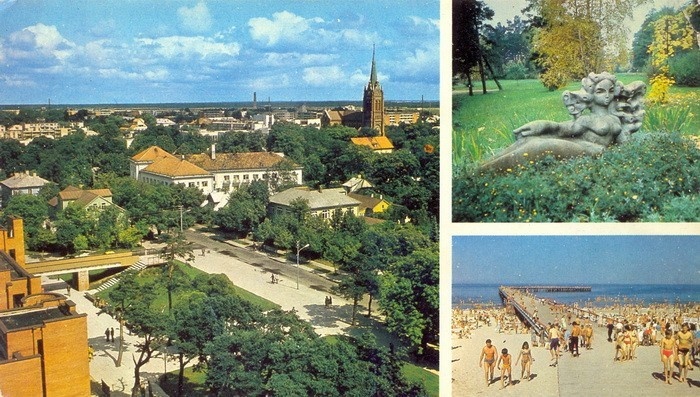 Паланга, так же как и Неринга, курортный город в том же Клайпедском уезде. На отдельную заметку он вытянул только потому, что открыток из Паланги у меня оказалось больше. В отличии от самой Клайпеды Паланга принадлежала Литве, а не Пруссии. И вместе с Литвой принадлежала сначала Речи Посполитой, а потом Российской империи. В 19-м веке это место стало владением князей Тышкевичей, которые и начали вкладывать деньги в развитие города, как морского курорта. В советские времена национализированные виллы были преобразованы в дома отдыха, а также построены несколько новых больших санаториев. Начнем с такого мультивью, на котором изображены: вид города с собором в неоготическом стиле, скульптура "Солнышко" и море. 1982 г. И сразу второй мультивью. Из той же серии и того же 1982 года. Дворец князей Тышкевичей, скульптура из народной литовской сказки, Балтийское море, княжеский парк. Ныне в княжеском имении находится самая главная достопримечательность города — музей янтаря. 1981. Фото З. Казан