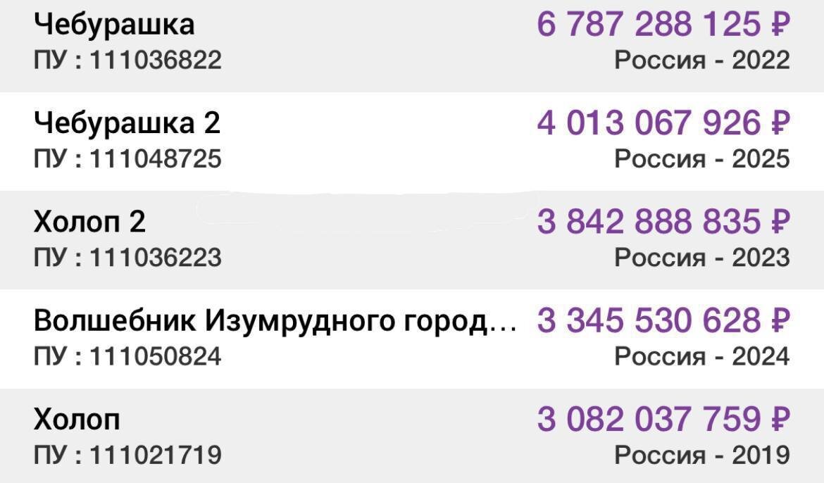 За восемь дней проката фильм собрал 4 млрд рублей. Его посмотрело уже более 7 млн человек. Первенство в этом списке по-прежнему сохраняет «Чебурашка» 2022 года.