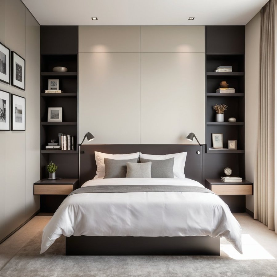 Для оптимизации пространства в маленькой спальне используйте полки и шкафы, которые занимают вертикальную плоскость. Настенные полки помогут не только сэкономить место, но и станут стильным элементом декора. Открытые полки идеально подходят для хранения книг, фотографий или декоративных предметов, создавая атмосферу уюта. Шкафы с высокими дверцами визуально вытягивают пространство вверх, а встроенные модели позволяют эффективно использовать уголки комнаты.